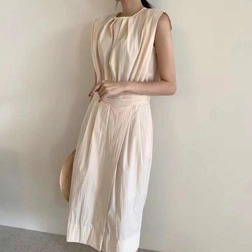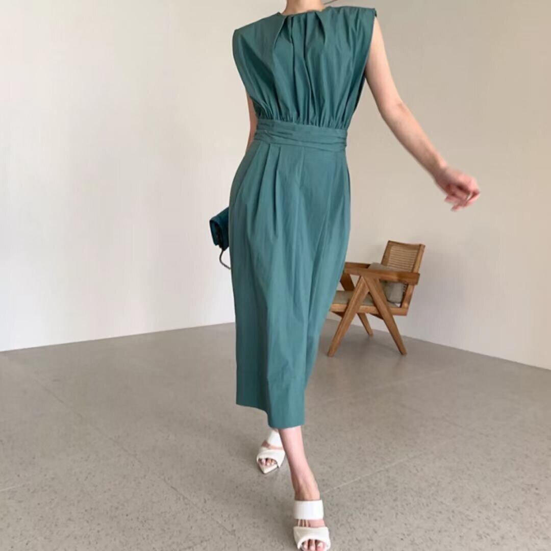 2021Oネックノースリーブサマー気質ドレス女性ウエストヒップAラインプリーツロングVestidosOLスリムドレス 夏物 Rhc83867957230