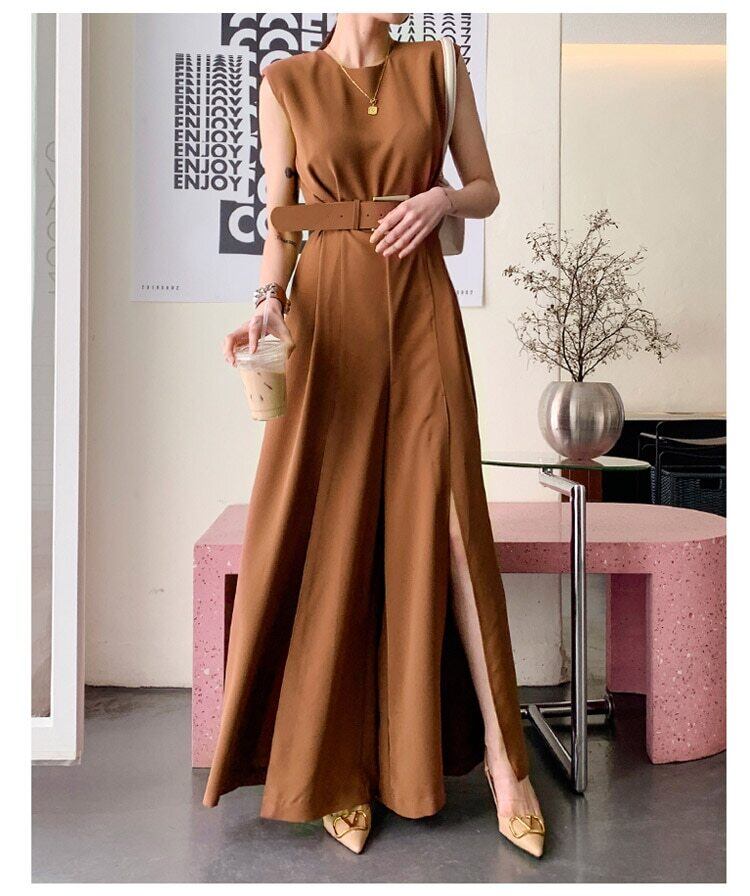 女性サマーノースリーブジャンプスーツ2021ベルト付きスプリットワイドレッグロンパースソリッドワークボディスーツパンタロンパンツ 夏物 ハーネス ワイドパンツ ソリッドカラー Rhc17003541645