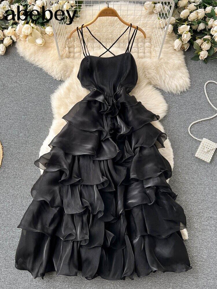 サマービーチロングドレスレディーススパゲッティストラップカスケードフリルビッグスイングベスティドスレッド/グリーン/ホワイトマキシローブ ラッフル 夏物 Abe44655822025