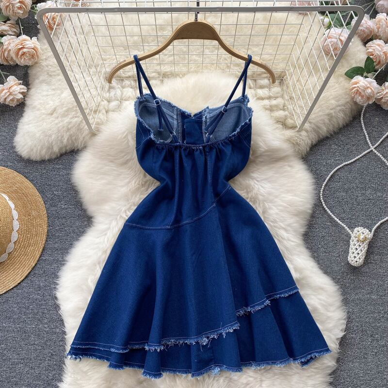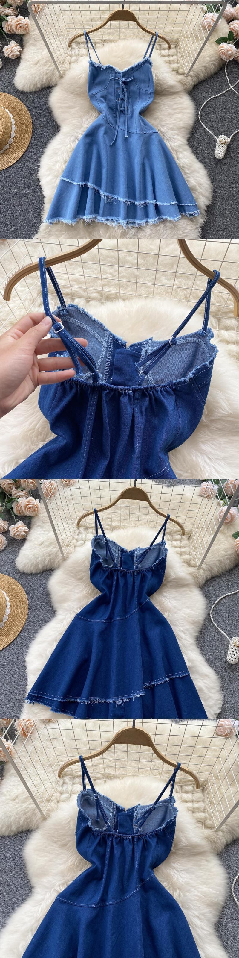 デニム巾着女性ミディドレスソリッドフレンチスタイル背中の開いたセクシーな不規則なレトロなドレス ソリッドカラー Abe32293659459