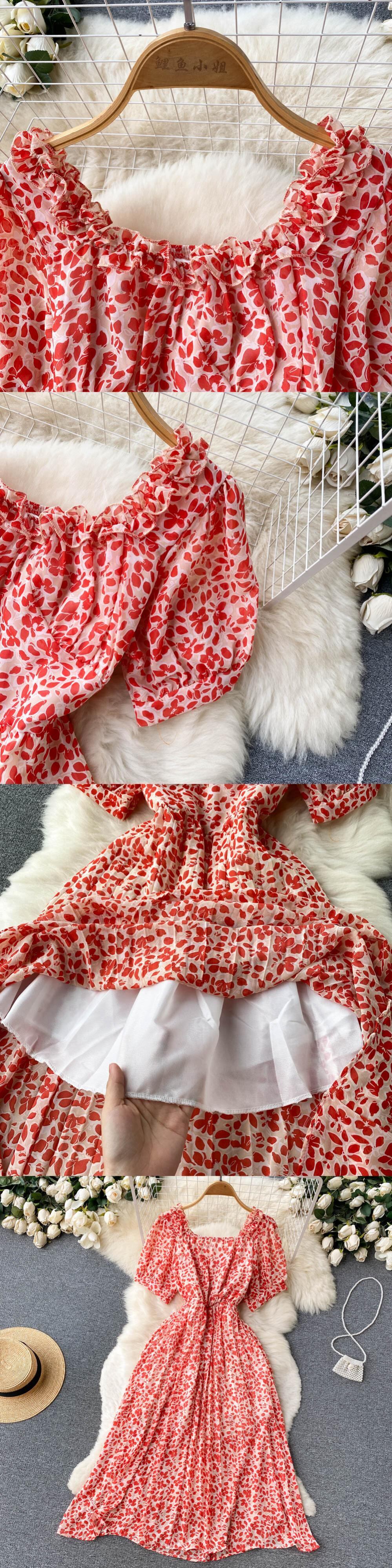 甘い花柄ドレス女性グリーンスクエアカラー半袖Aラインドレス夏ボヘミアンプリントビーチサンドレス ショート ハーフスリーブ 大人ガーリー スウィート キュート カジュアル サマー 夏物 スクウェア Abe21161935562