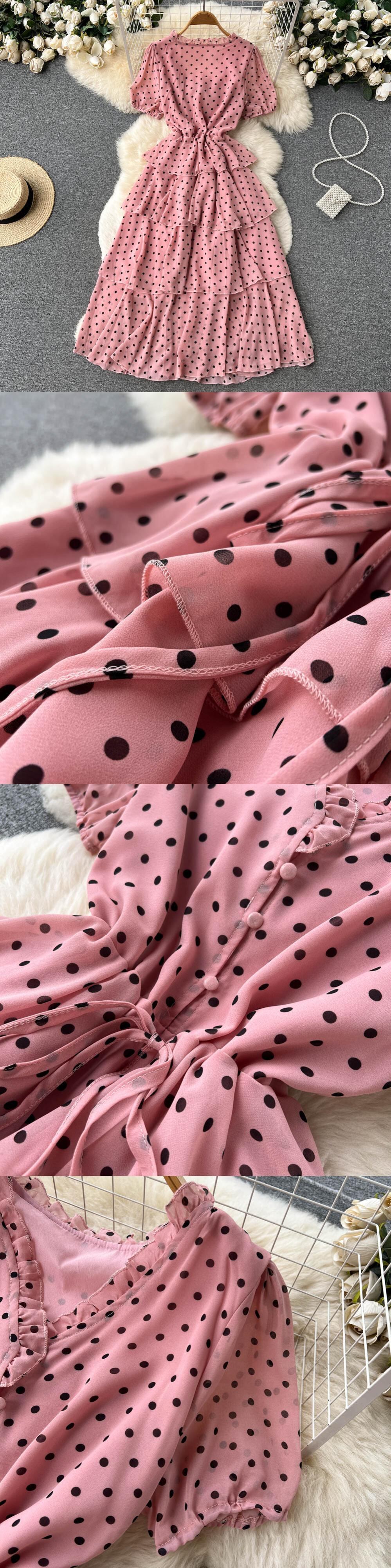 夏の女性ポルカドットカスケードフリルミディドレスVネックショートパフスリーブシングルブレストベスティドスローブ サマー 夏物 Abe61790579319