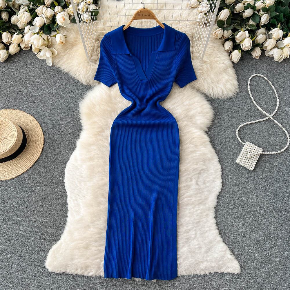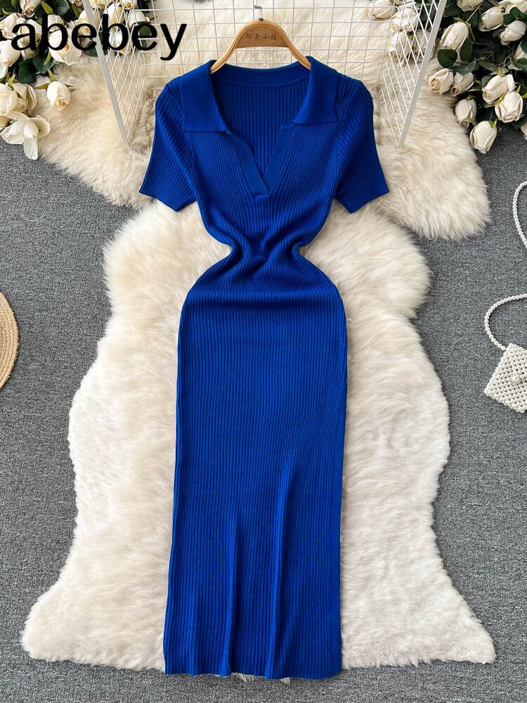 女性サマーニットドレス2022Vネックストリートウェアスリムミディショートサンドレス伸縮性ウエストセクシーボディコンドレス エラスティック 夏物 Abe66349876520