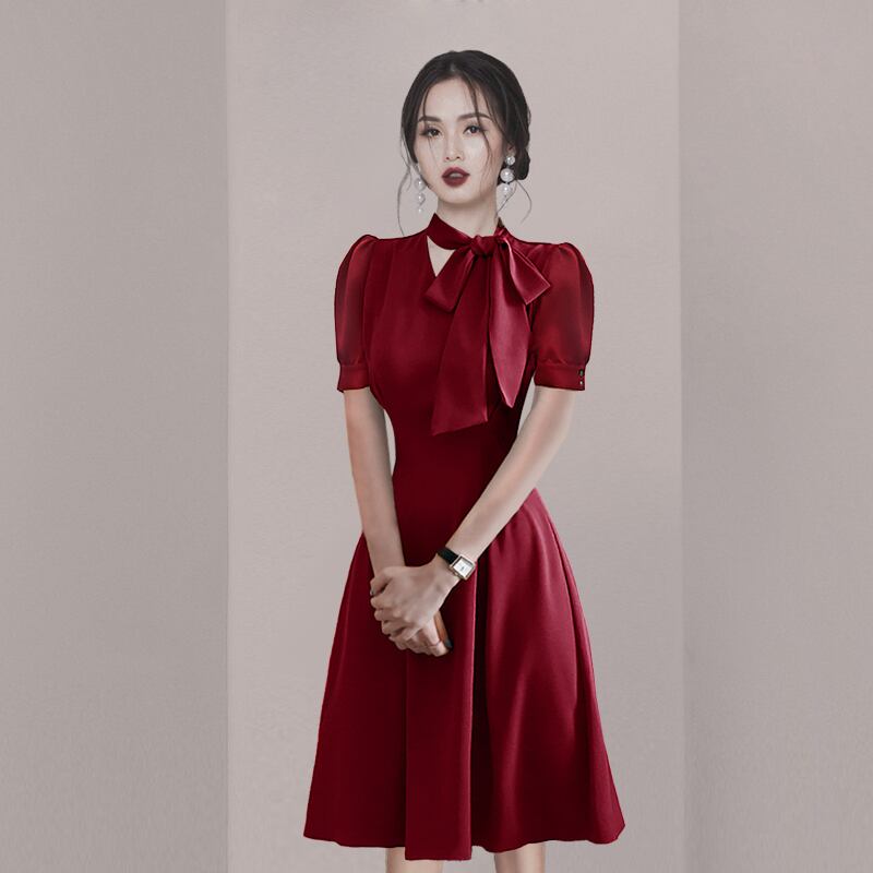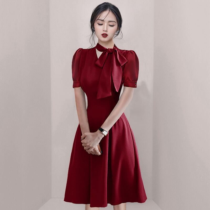 2022ソリッドウエストローブパフスリーブ女性ミディドレス春VネックAラインレディパーティーボウバンデージドレス リボン スプリング 春物 ソリッドカラー Rhc31158119978