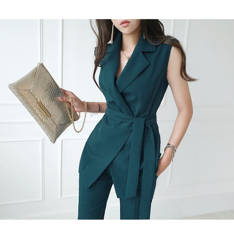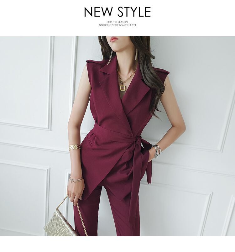 スタイリッシュな2ピースブレザーセットノースリーブレースアップジャケット&ペンシルパンツ夏の女性のパンツスーツ サマー 夏物 Rhc87691363807