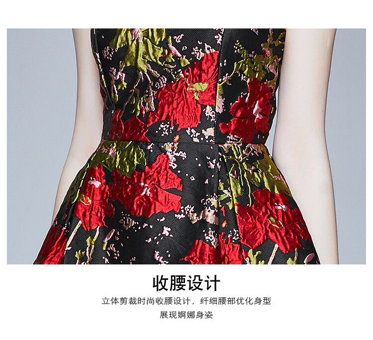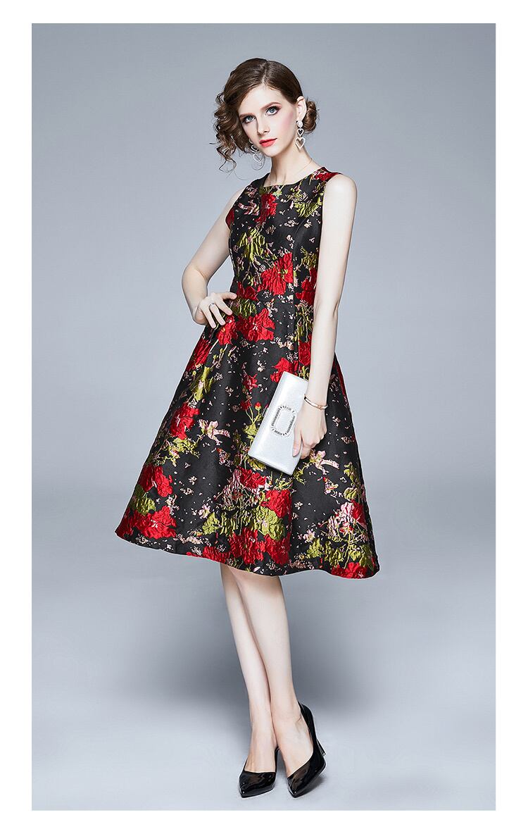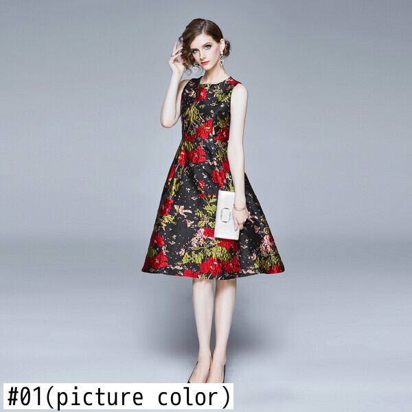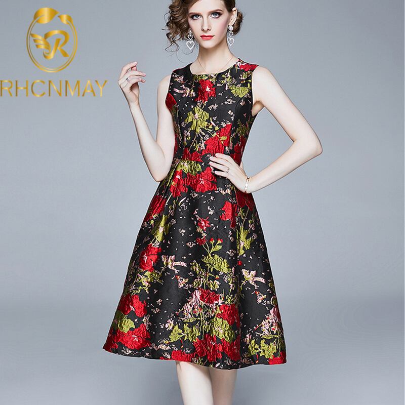 夏のパーティージャカードノースリーブドレス女性OネックAラインプリーツ膝丈ドレスVestidos サマー 夏物 Rhc56746755855