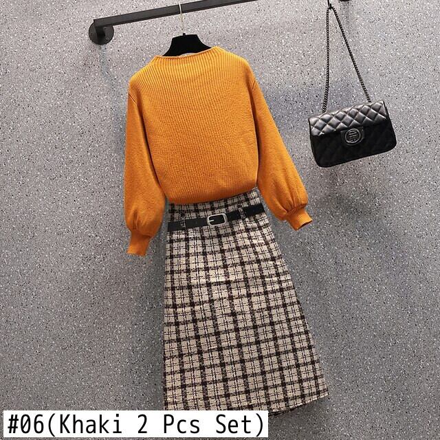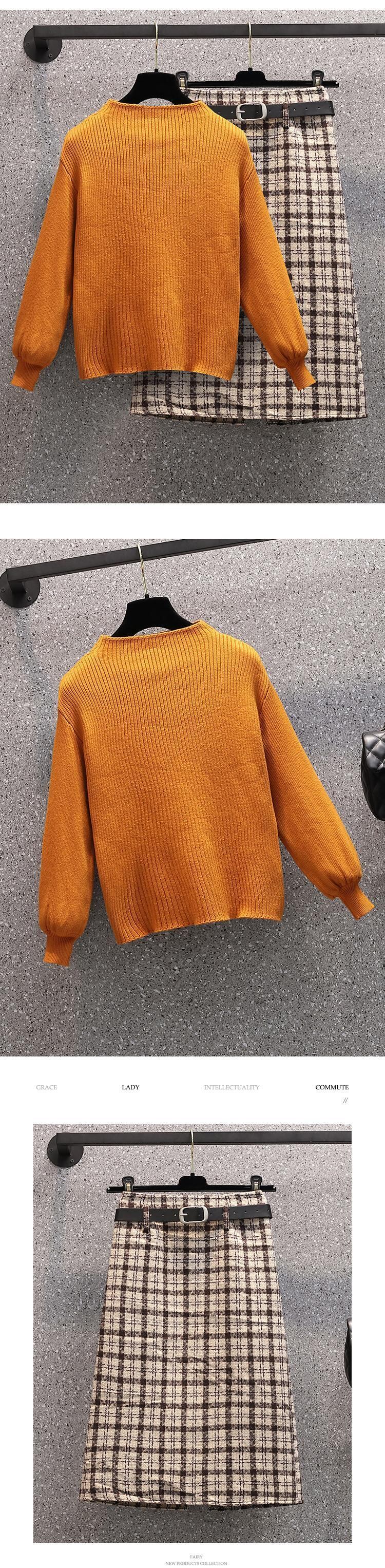 女性秋冬セットタートルネックセータートップスとツイードチェック柄ロングスカートスーツオフィスツーピースセット オータム 秋物 ウィンター 冬物 会社 学校 通勤や通学にも Rhc96063028139