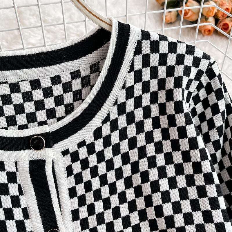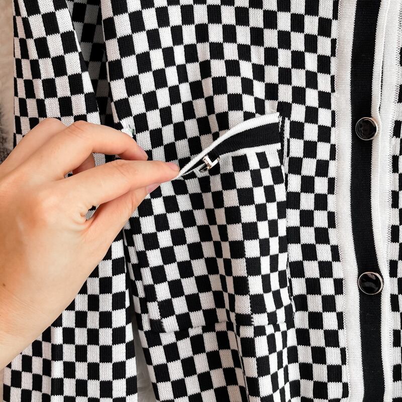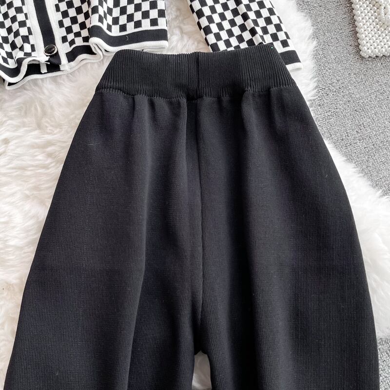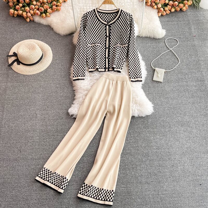 秋のツーピースセットシングルブレストカーディガンセータートラックスーツストライプチェック柄レディースニットワイドレッグパンツスーツ2ピースセット オータム 秋物 ワイドパンツ Rhc58756184326