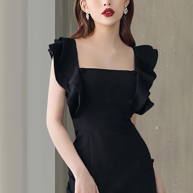 2020女性セクシーな黒の黒のスプリットドレスシースフリルバタフライスリーブボディコンスクエアカラーレディパーティードレス ブラック ラッフル スクウェア Rhc38358737546