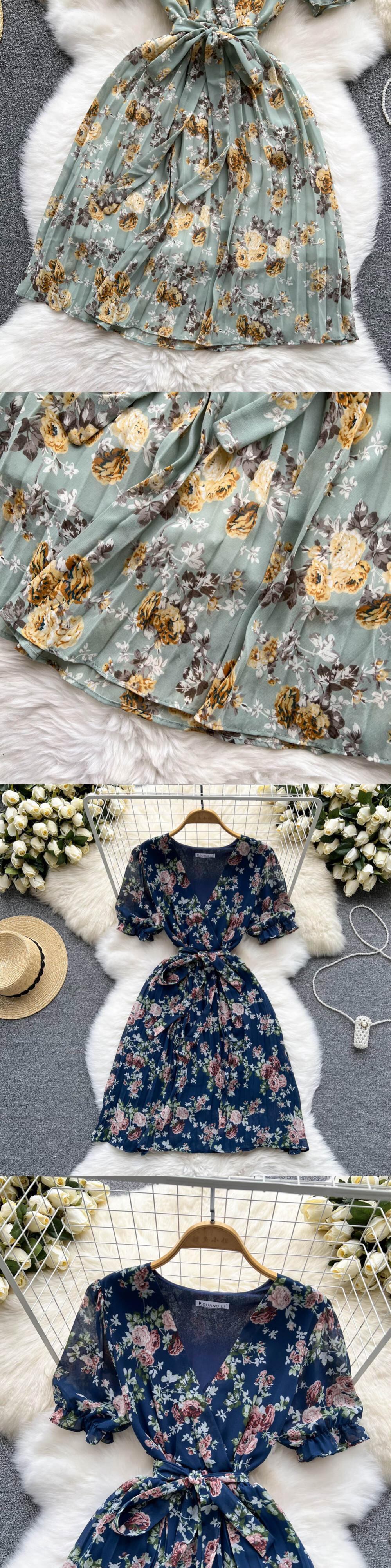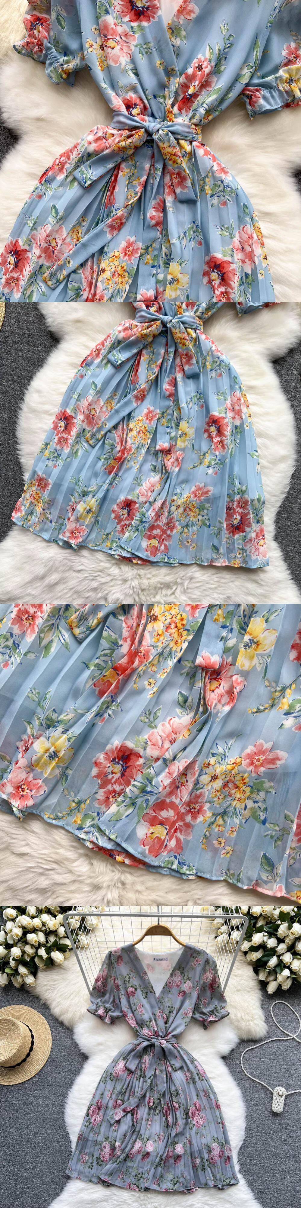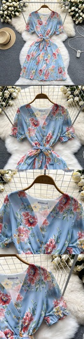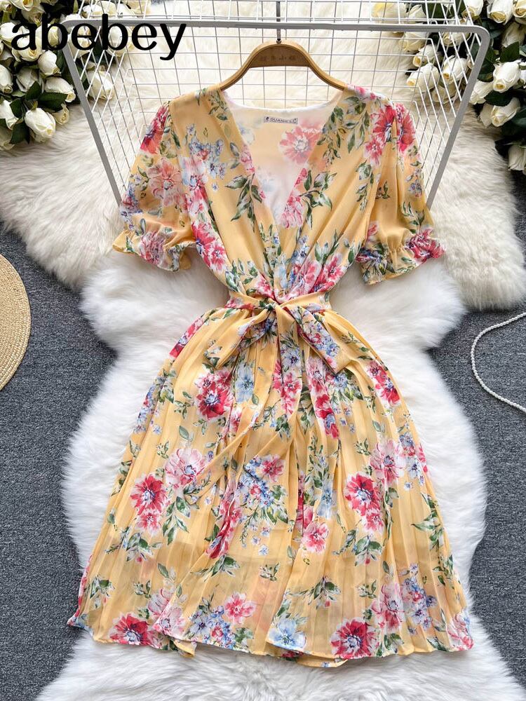 夏のボヘミアンプリントシフォンドレス女性セクシーなVネック半袖半袖ウエストAラインフリルビーチVestidos ショート ハーフスリーブ サマー 夏物 Abe75701496317