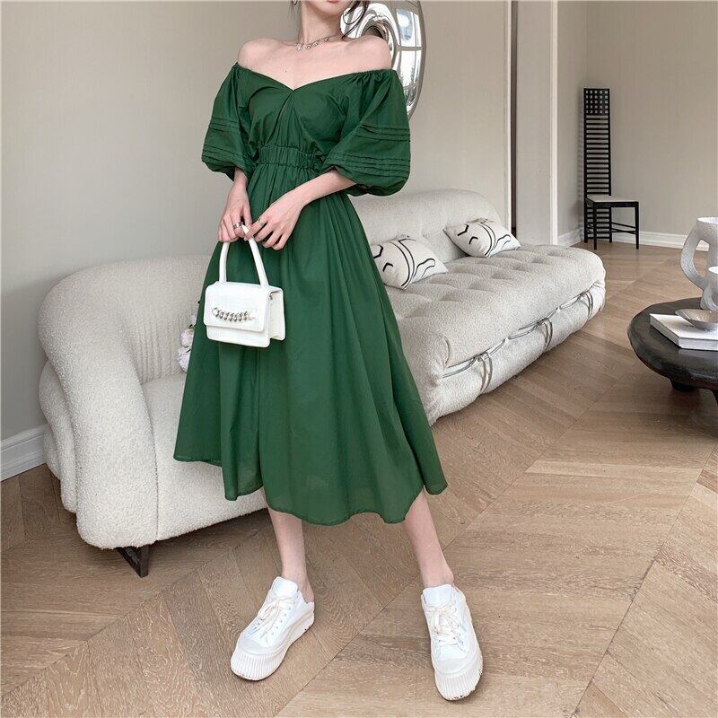 Frenshスタイルのプリーツボウドレススリムな伸縮性のあるWasitパフスリーブドレス2021夏のソリッドVネックSweetVestidosドレス リボン エラスティック 大人ガーリー スウィート キュート カジュアル サマー 夏物 ソリッドカラー Rhc82062050942
