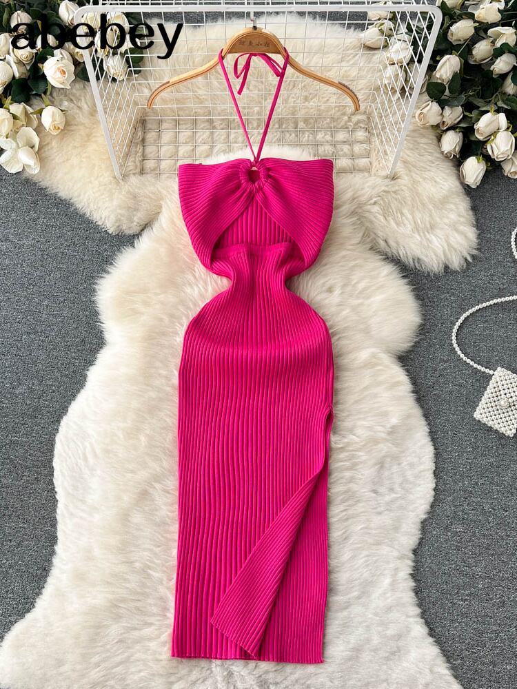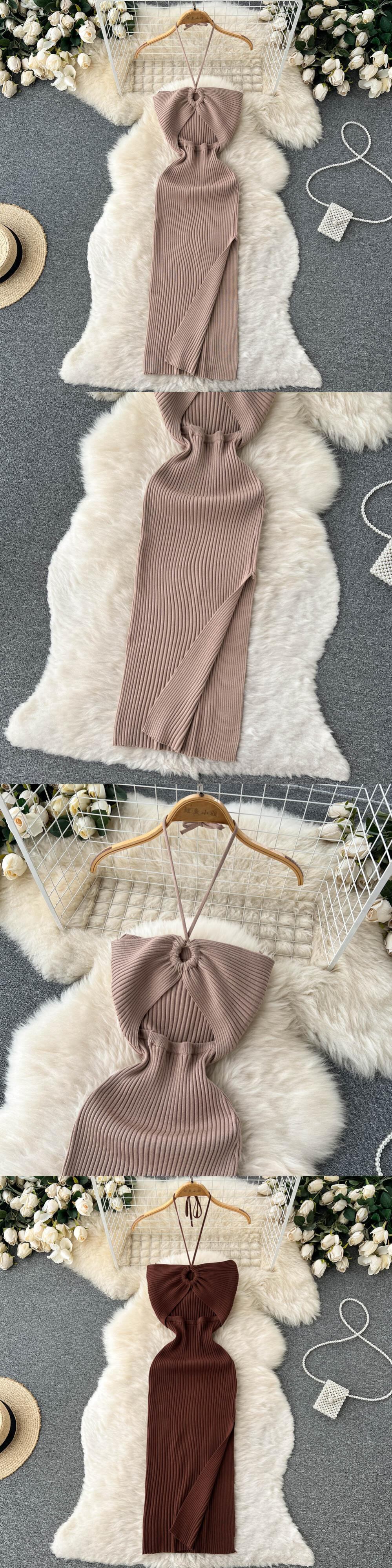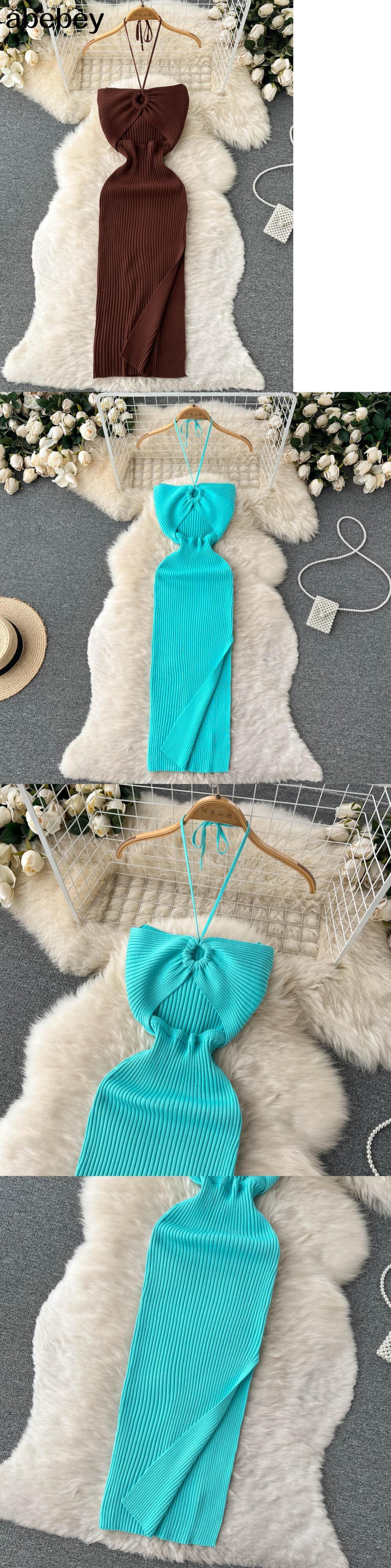 グリーンホルターノースリーブニットボディコンドレスレディースサマーストレッチミディドレスソリッドドレス 夏物 ソリッドカラー Abe6909545397