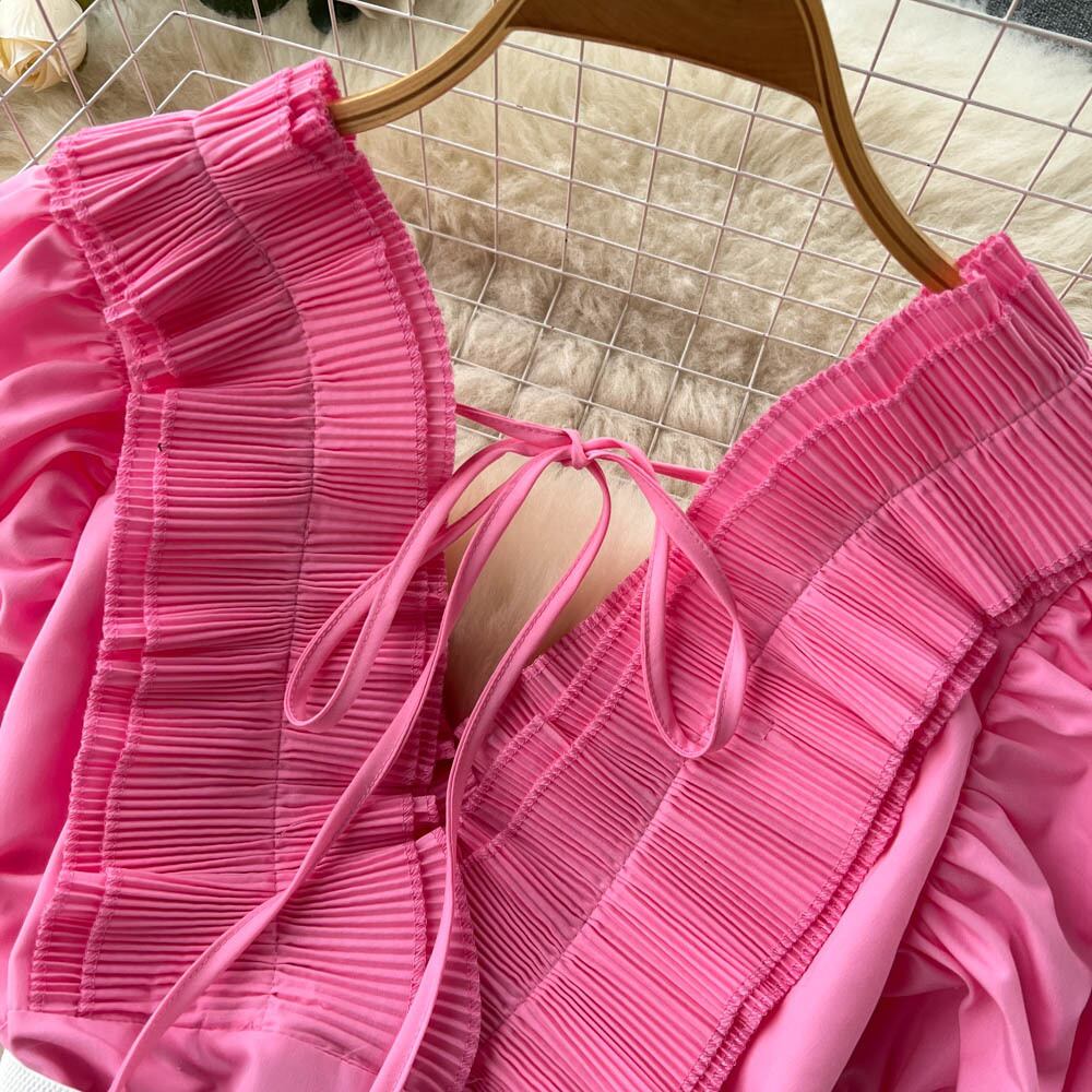 サマービーチロングドレスレディースVネック半袖カスケードフリルビッグスイングベスティドスホワイト/ブラック/ピンクマキシローブ ショート ハーフスリーブ ラッフル 夏物 Abe67310665623