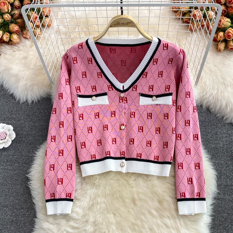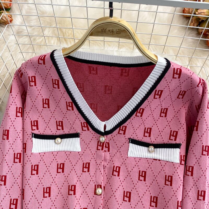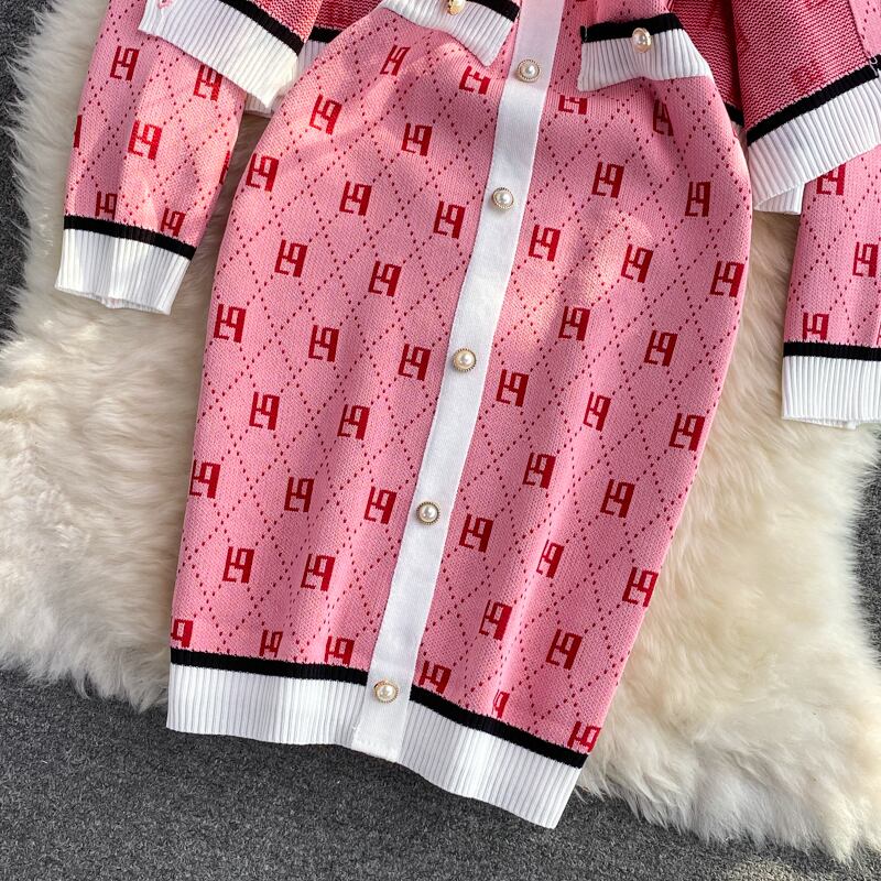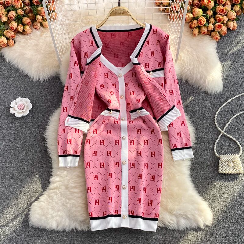 秋の女性ニットドレス2ピースセット女性ピンクプリントカーディガンコート+シックなスパゲッティストラップボディコンドレススーツ オータム 秋物 Rhc94506542055