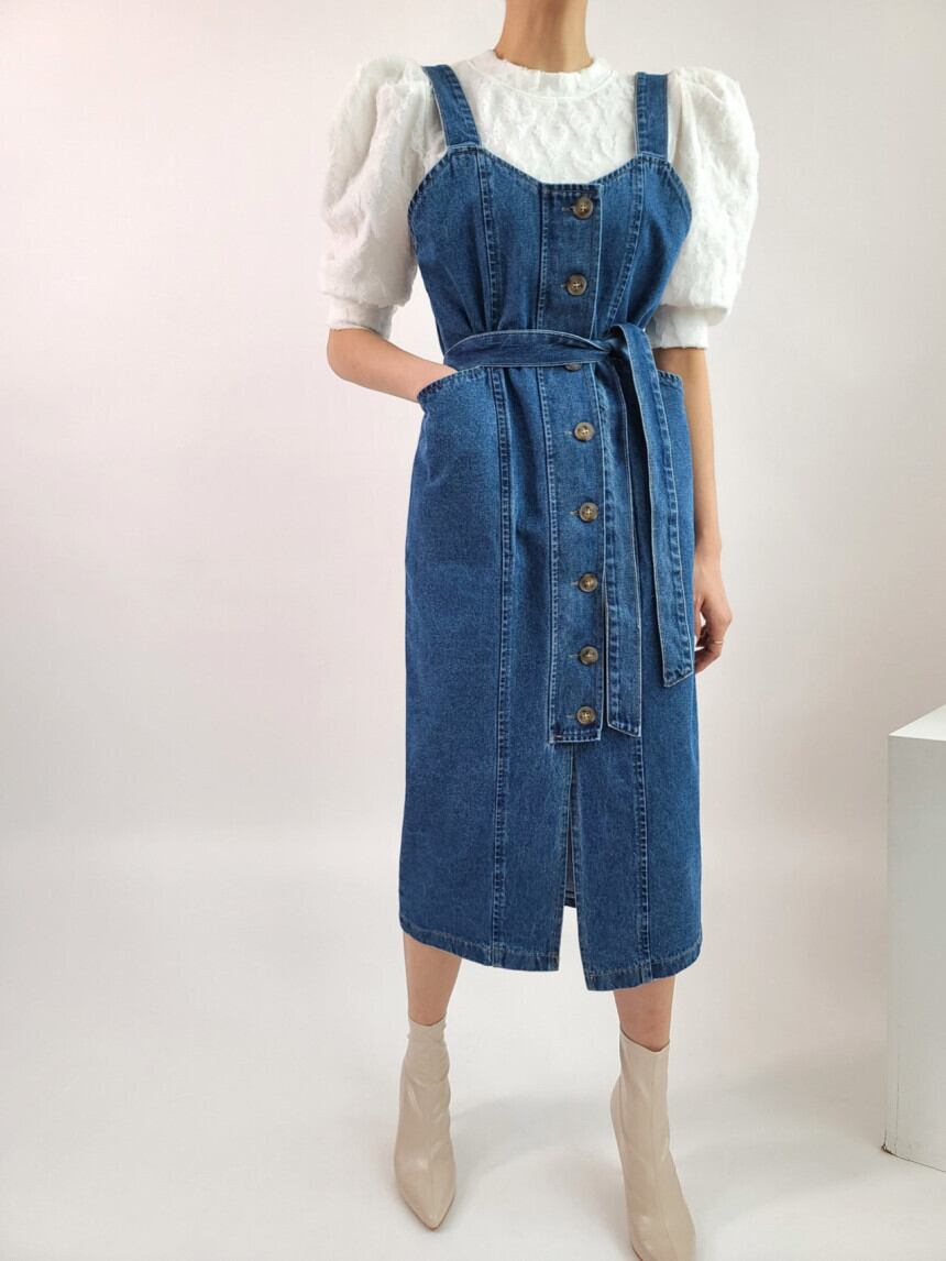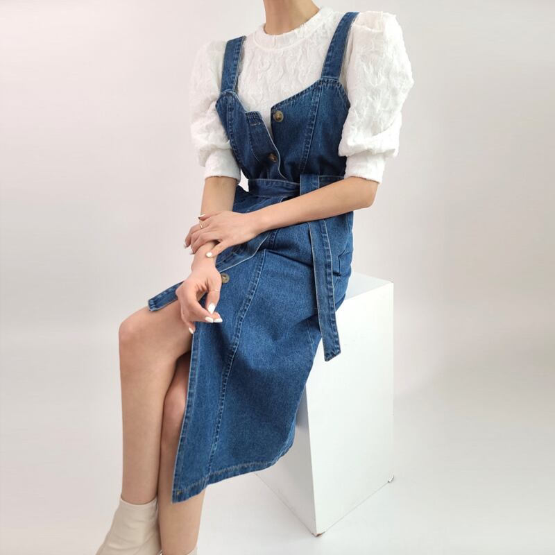 デニムドレスレディースイングランドスタイルデニムボタンドレスポケットスパゲッティストラップエンパイアスクエアカラードレス スクウェア ヨーロピアン Rhc43557278299