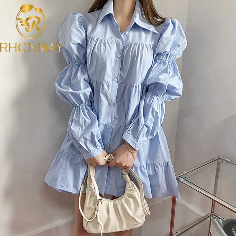 2021年夏のシックなスウィートターンダウンカラー無地シングルブレストプリーツロングパフホワイトスリーブシャツドレス 大人ガーリー キュート カジュアル サマー 夏物 ソリッドカラー Rhc97733390148
