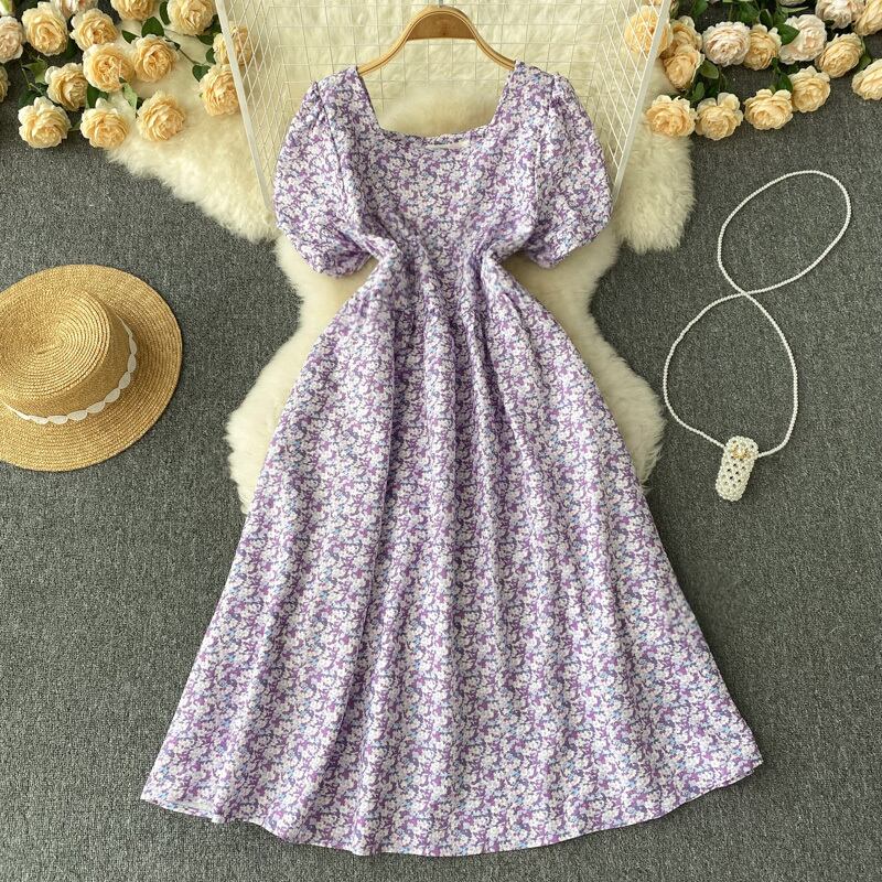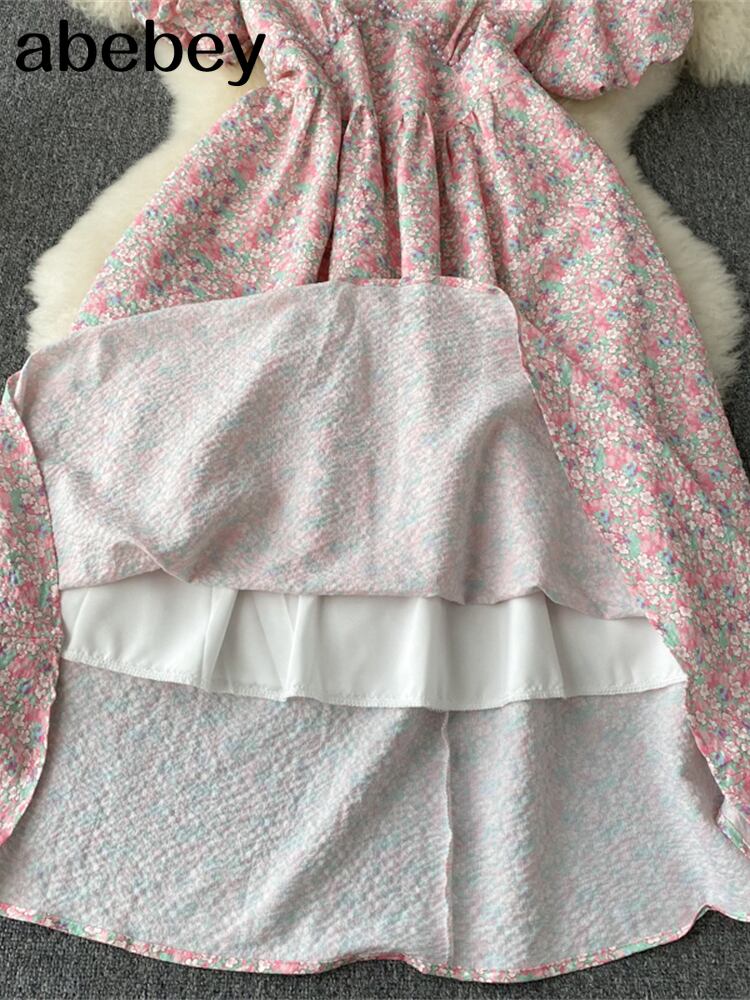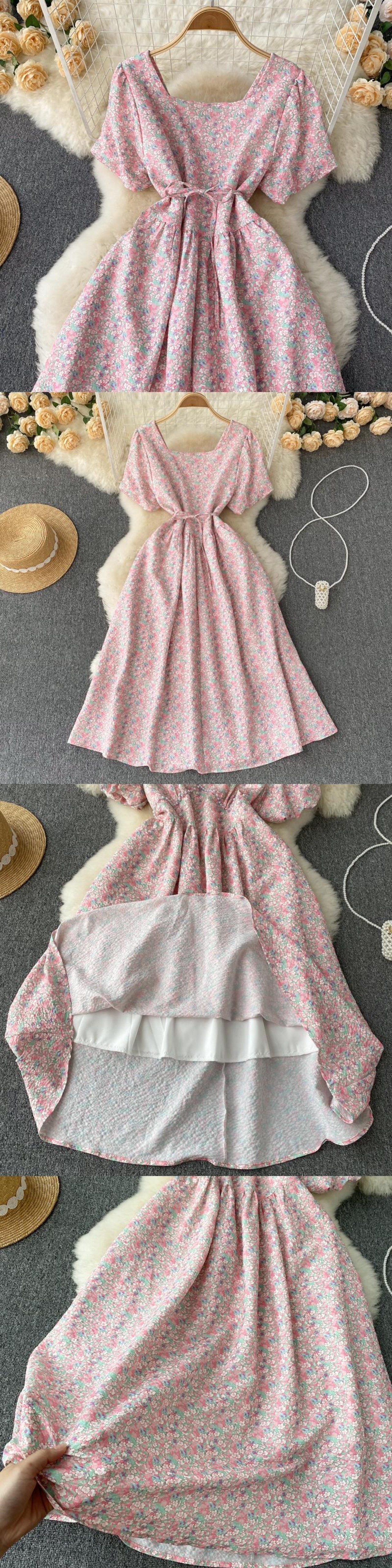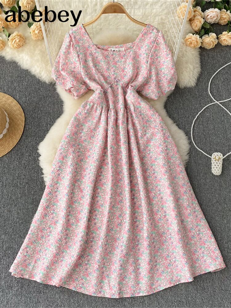 甘いサマードレス女性スクエアカラー半袖ミディドレスローブVestidos服2022 ショート ハーフスリーブ 大人ガーリー スウィート キュート カジュアル 夏物 スクウェア Abe47878056793