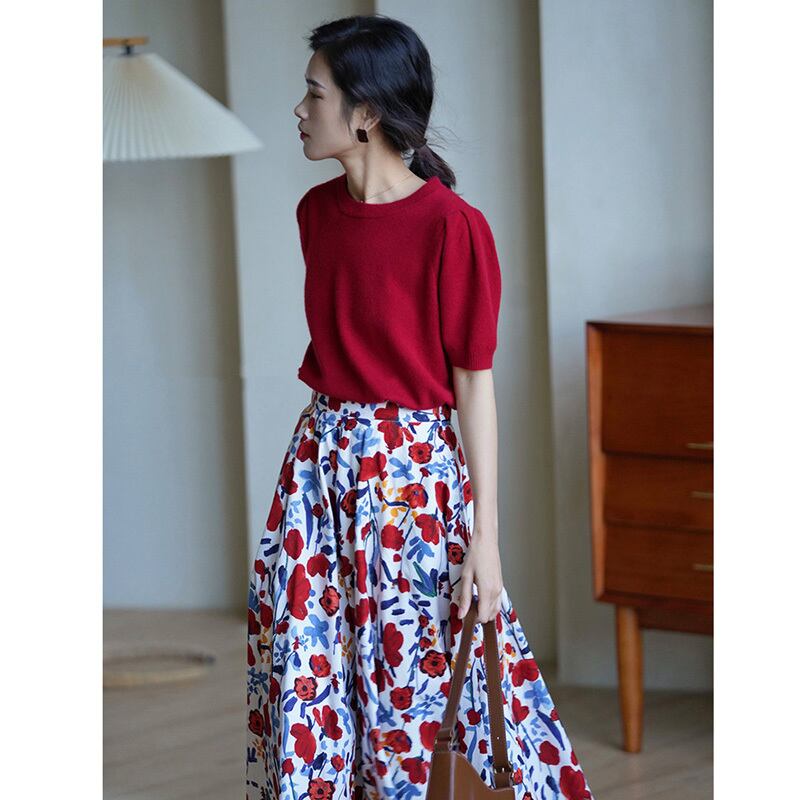 2022年夏の女性用ツーピースセットウエストフラワープリントビーチスカートと半袖ラウンドネックレッドTシャツスーツ ショート ハーフスリーブ サマー 夏物 Oネック フラワーデザイン Rhc1414450076