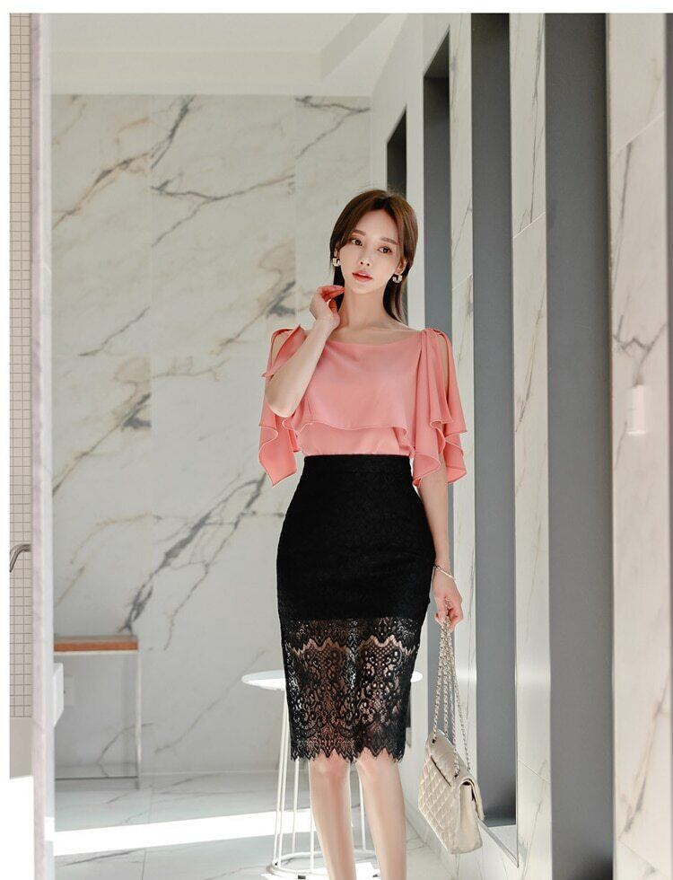 オフィスレディスーツ女性サマーフリルブラウストップス+ウエストシースボディコンレーススカートセクシーなツーピースセットの衣装 ラッフル 夏物 会社 学校 通勤や通学にも Rhc39376684055