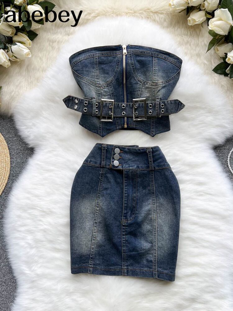 デニムセクシーな女性セット2022年夏のジッパースラッシュネックトップスサッシュミニスカートスリムツーピースセット サマー 夏物 Abe93284821795