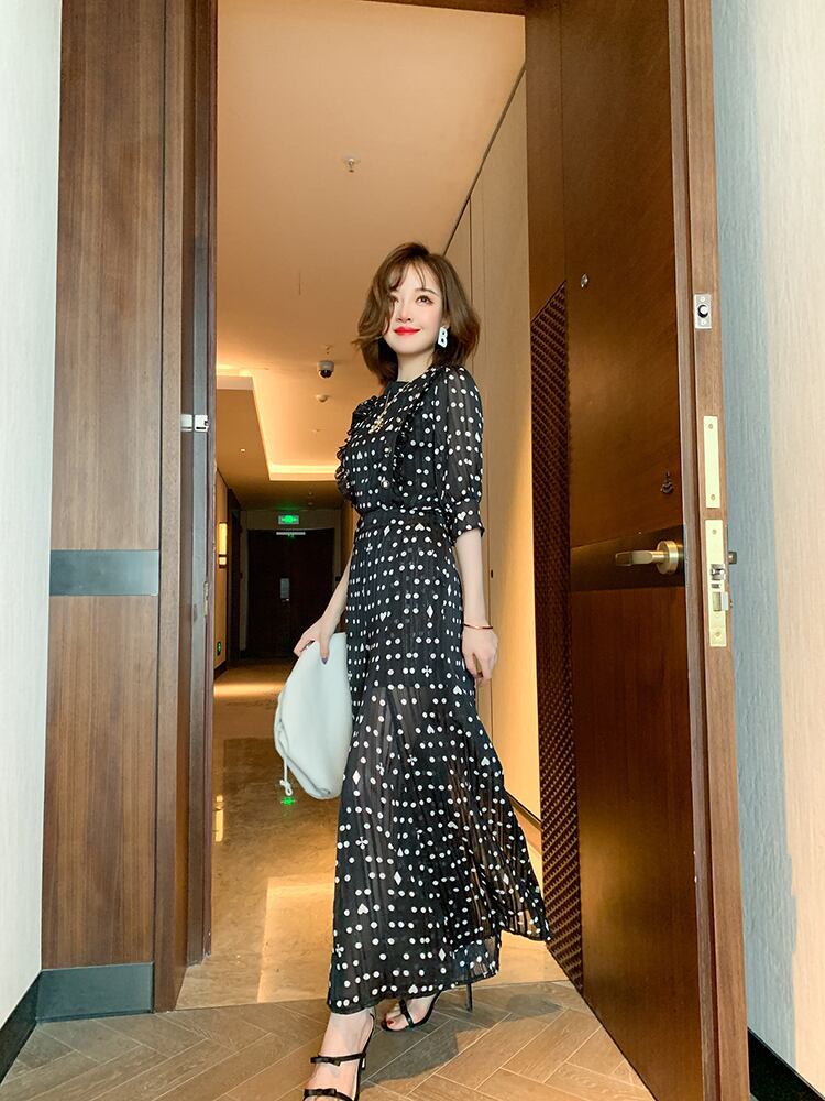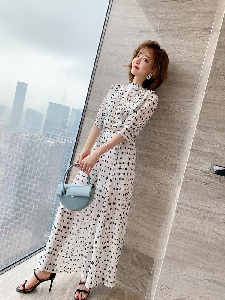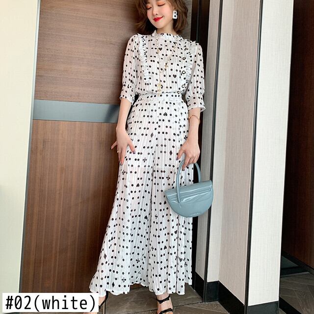 女性の水玉パンツスーツサマーシフォンOネックフリルシャツ+ホリデープリーツワイドレッグパンツセット ラッフル 夏物 Rhc61613483039