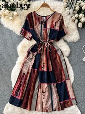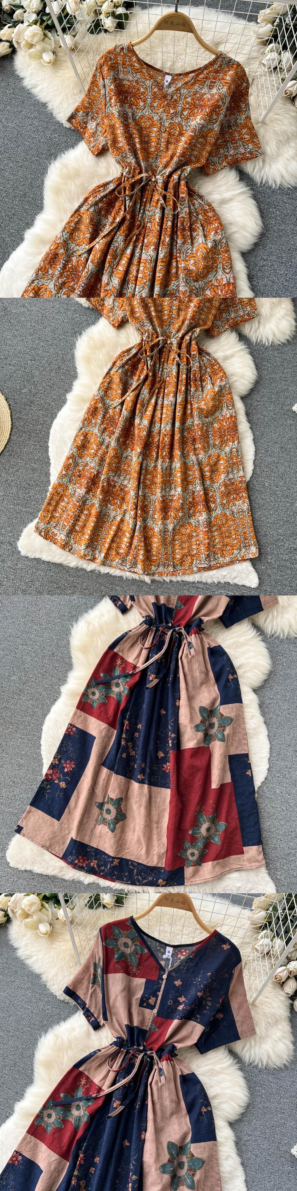 夏の女性のドレスボヘミアンフローラルプリントホリデーローブVestidosVネック半袖ミディサンドレス ショート ハーフスリーブ サマー 夏物 花柄 Abe95724887837