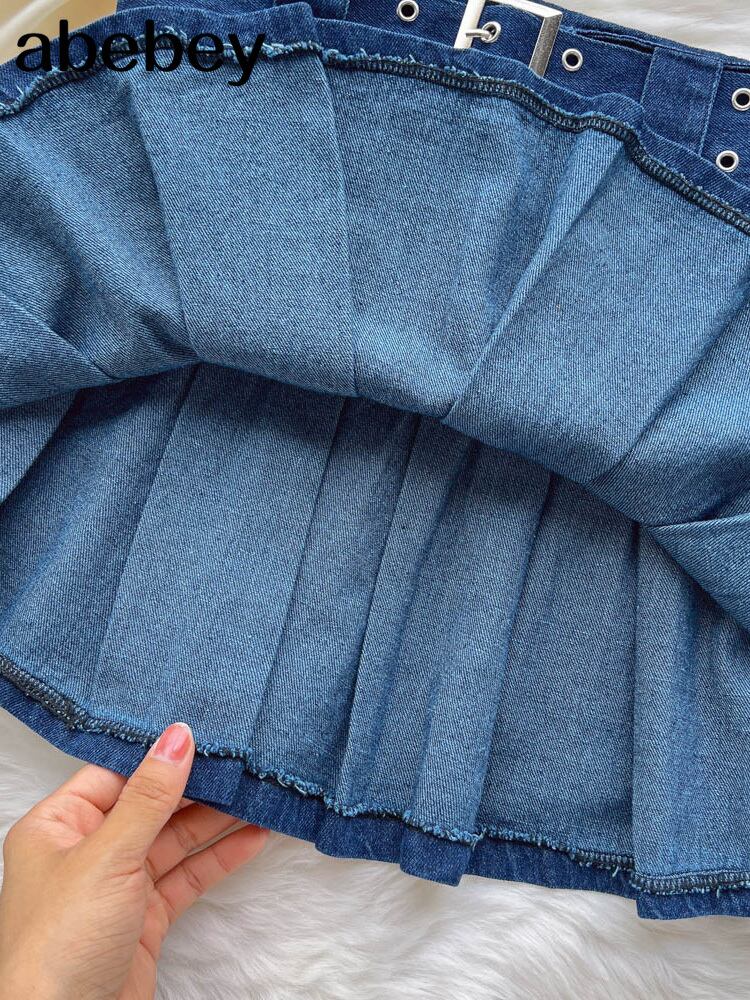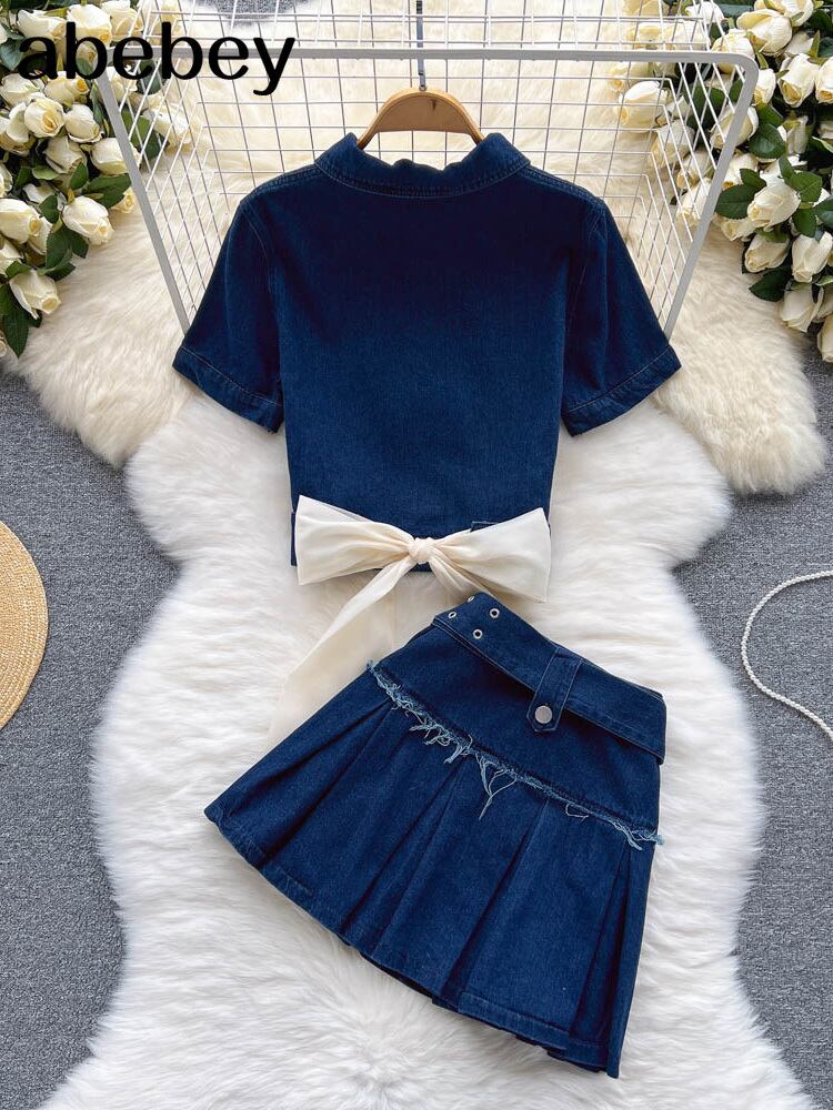 フレンチスタイルデニムレディースセット2022年夏シングルブレストポロネックトップス+ミニAラインスカートツーピースセット衣装 サマー 夏物 Abe61123183041