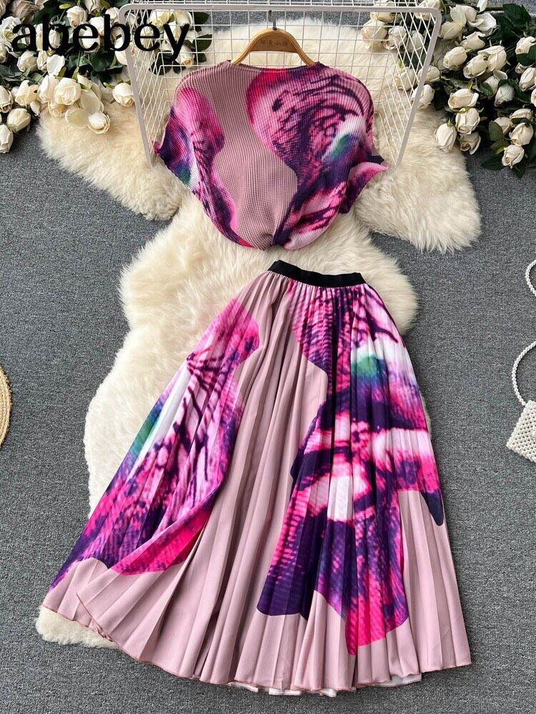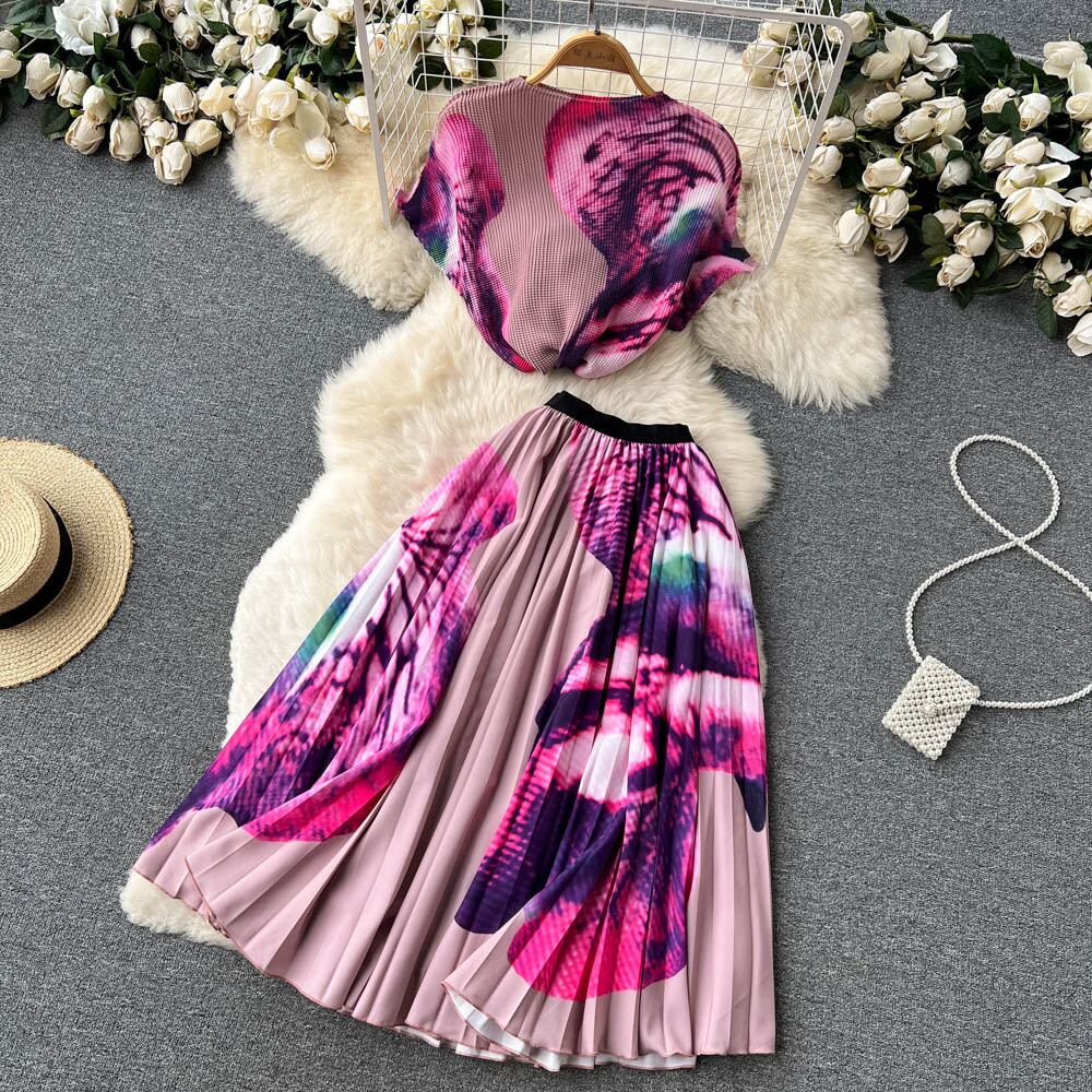ボヘミアンバケーションビーチ2ピースセットレディースフローラルプリント半袖トップスとウエストプリーツロングスカートスーツ春夏 ショート ハーフスリーブ スプリング 春物 サマー 夏物 花柄 Abe91042808262