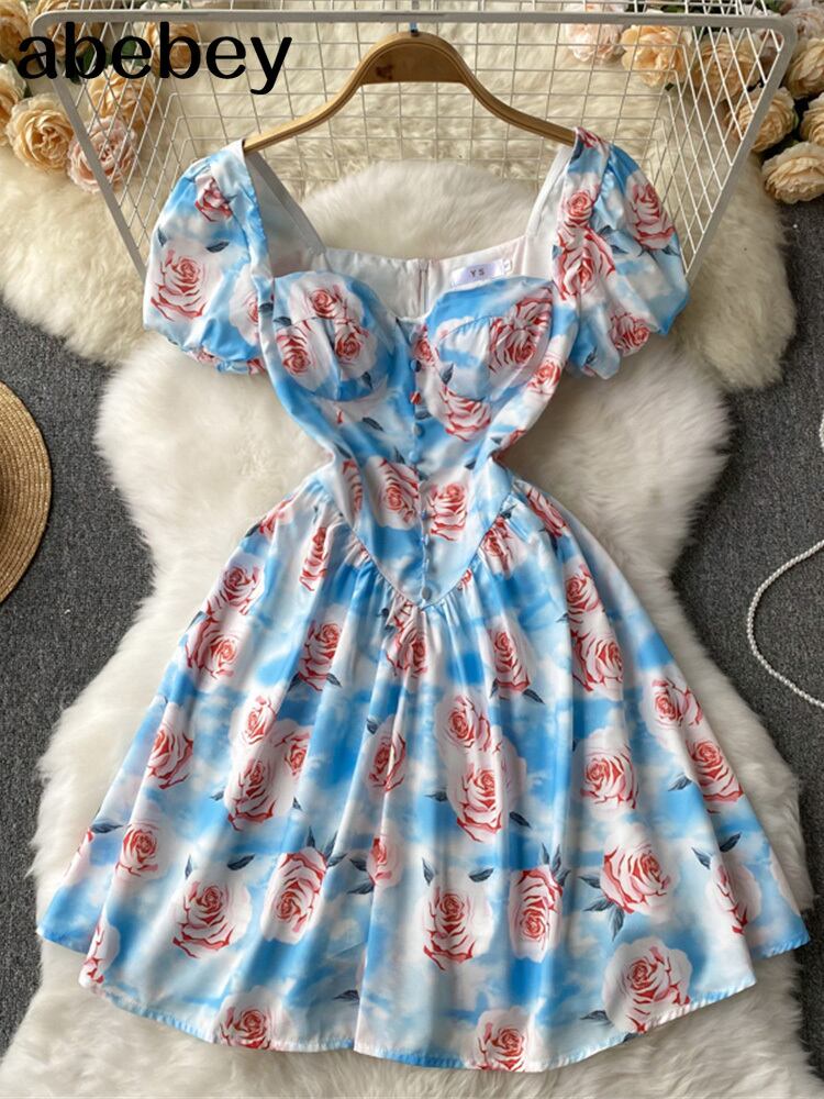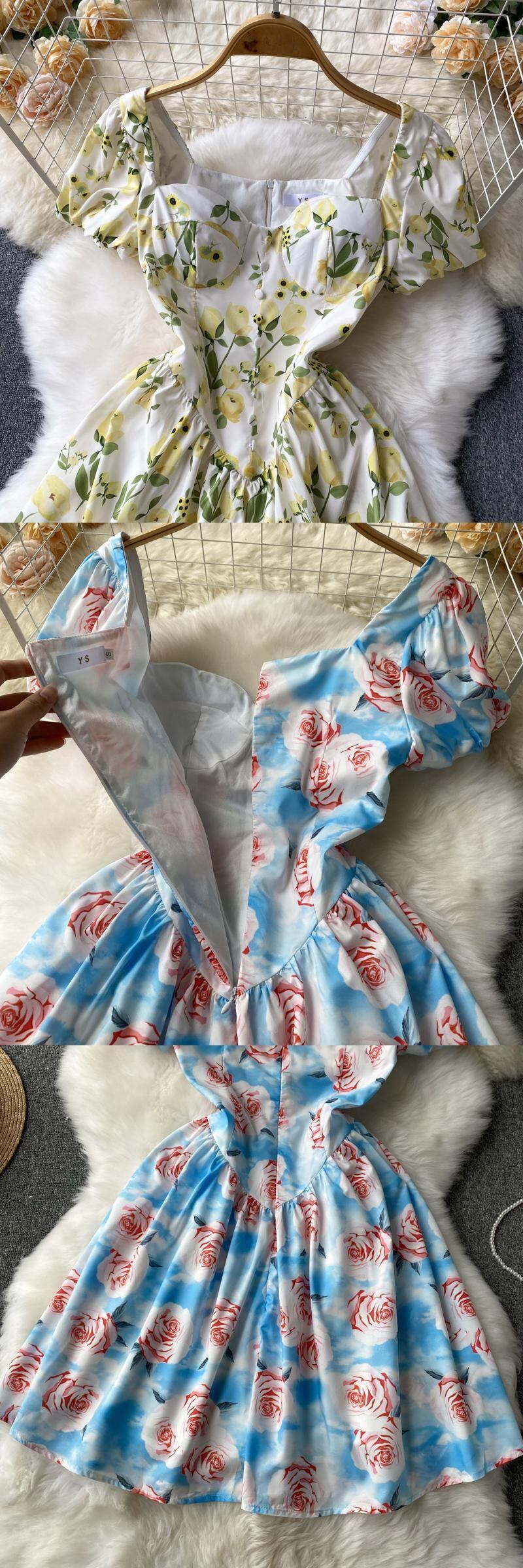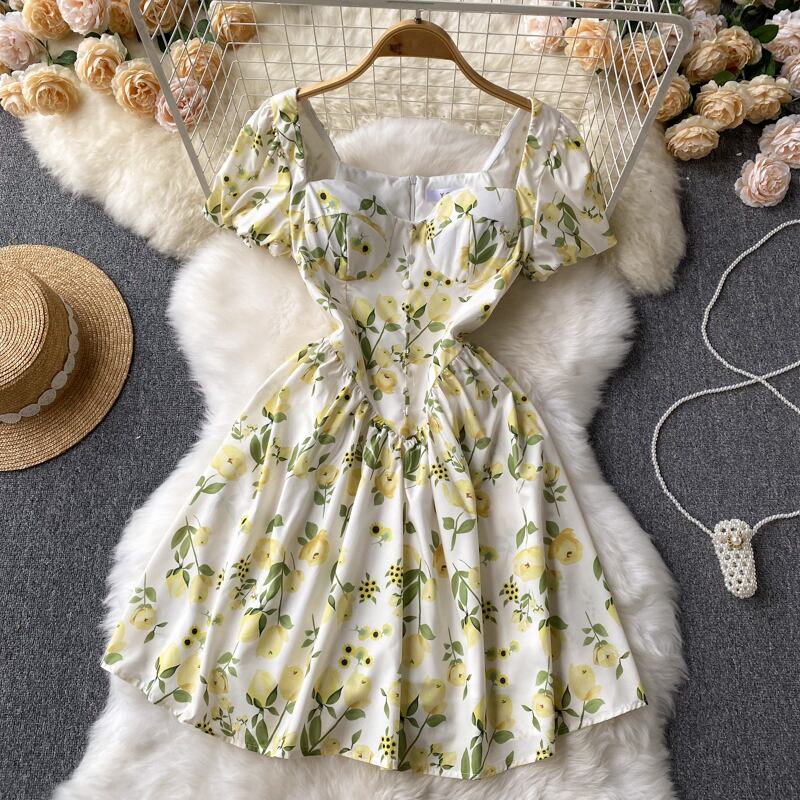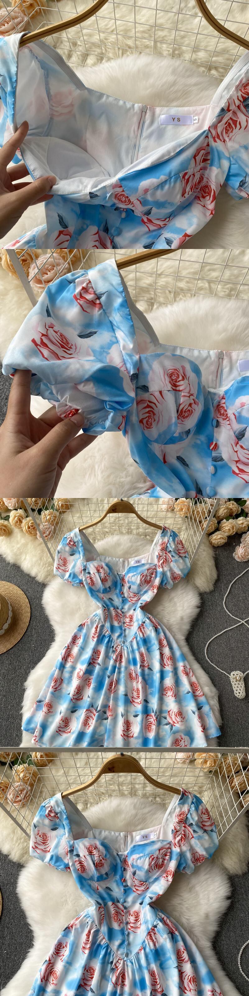 女性フラワープリントスウィートハートネックラインパディングミニショートドレスフランスシックな夏フローラル自由奔放に生きるエルビーゼ 大人ガーリー キュート カジュアル サマー 夏物 花柄 フラワーデザイン Abe90872290502