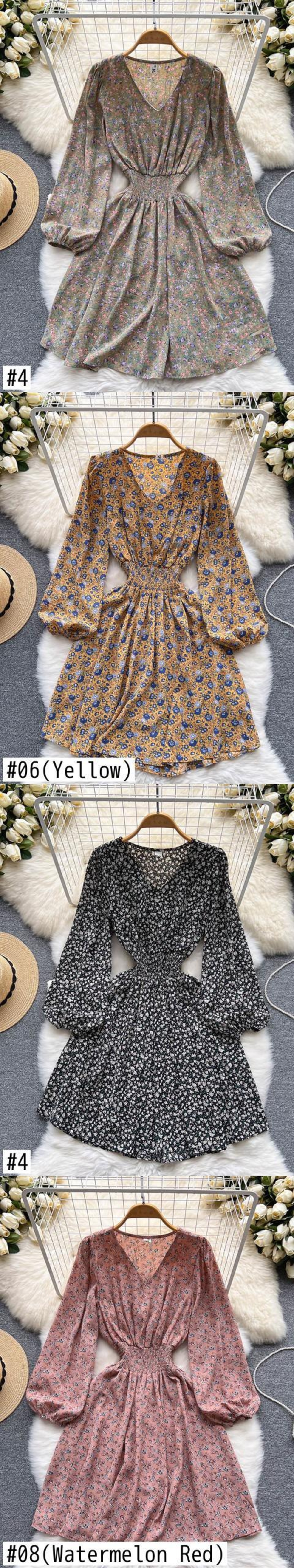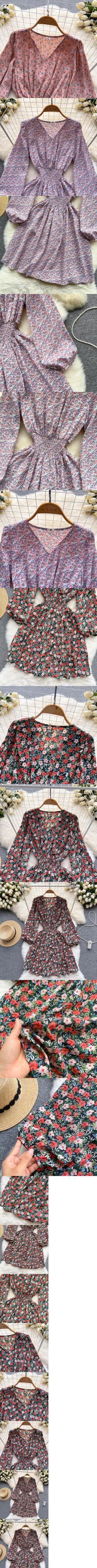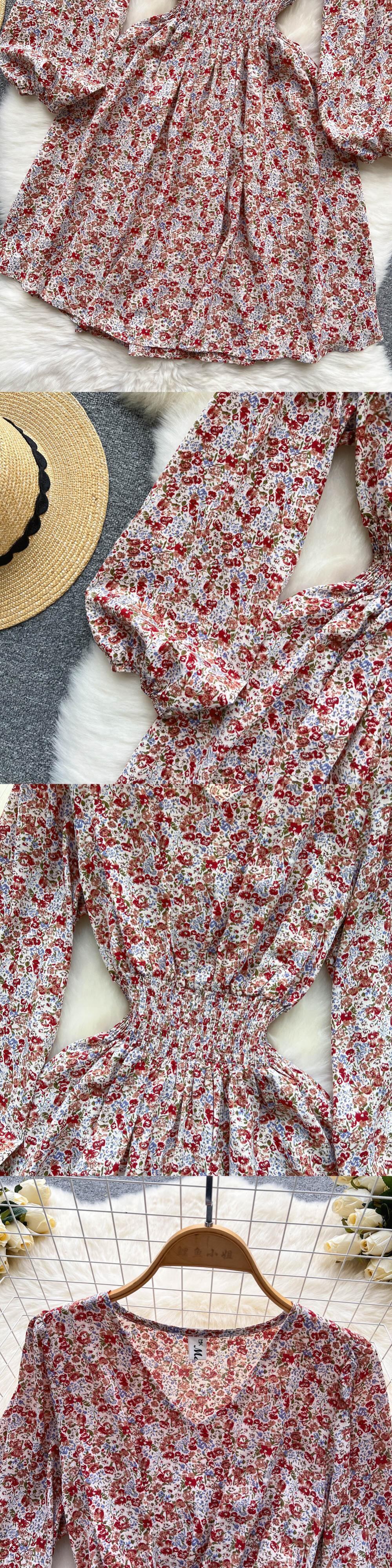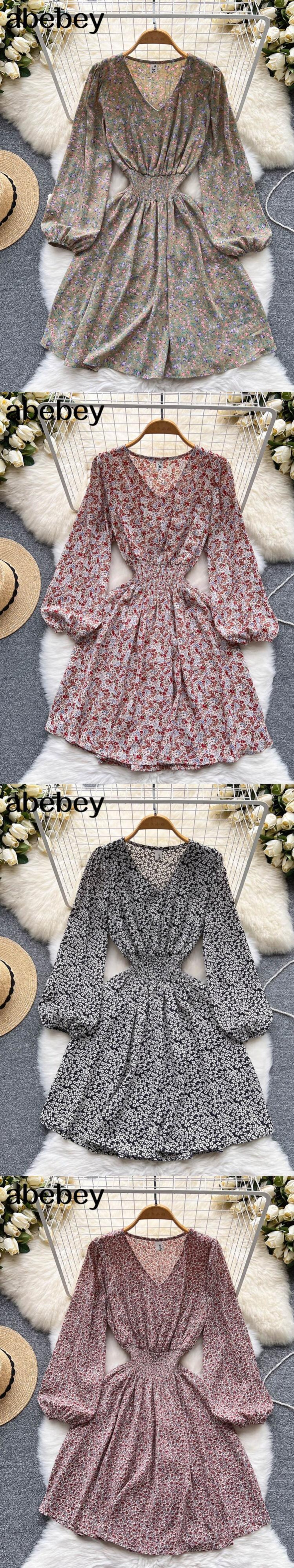 2022年秋フレンチVネック長袖ショートドレスフリルハイウエストレースアップフローラルプリントミニAラインワンピース ハイウェスト ロング ラッフル オータム 秋物 花柄 Abe6709716880