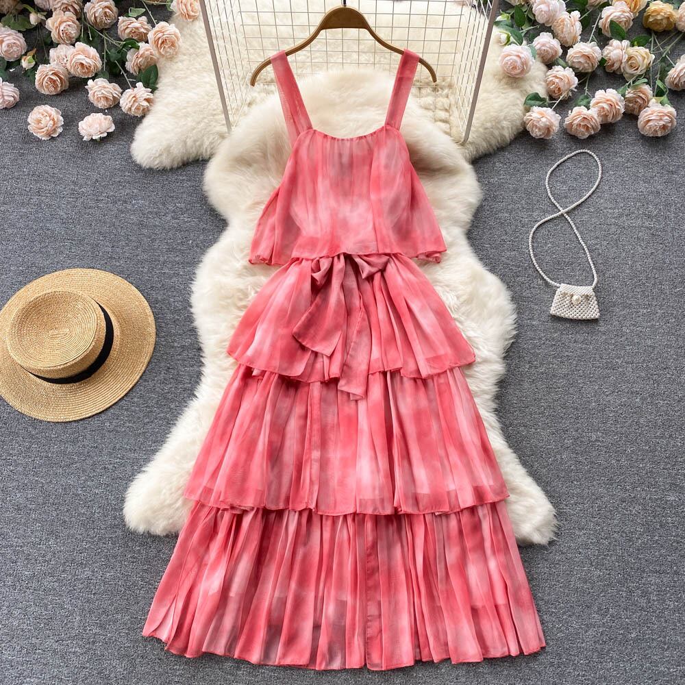 タイダイピンクのスリングプリントの女性のドレス夏のセクシーなホリデースタイルのマキシドレス-ウエストレースアップフリルドレス サマー 夏物 Abe88825818441
