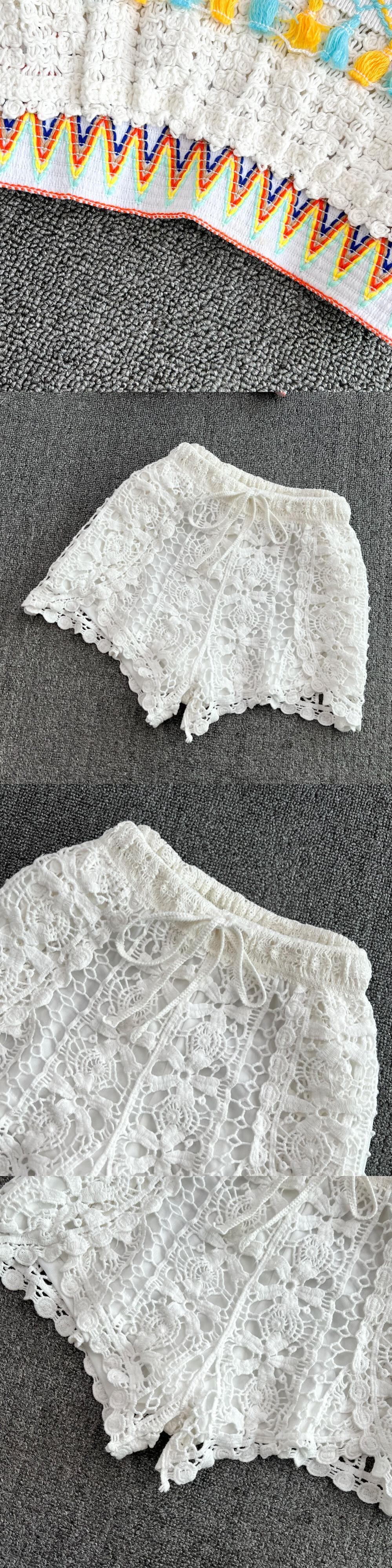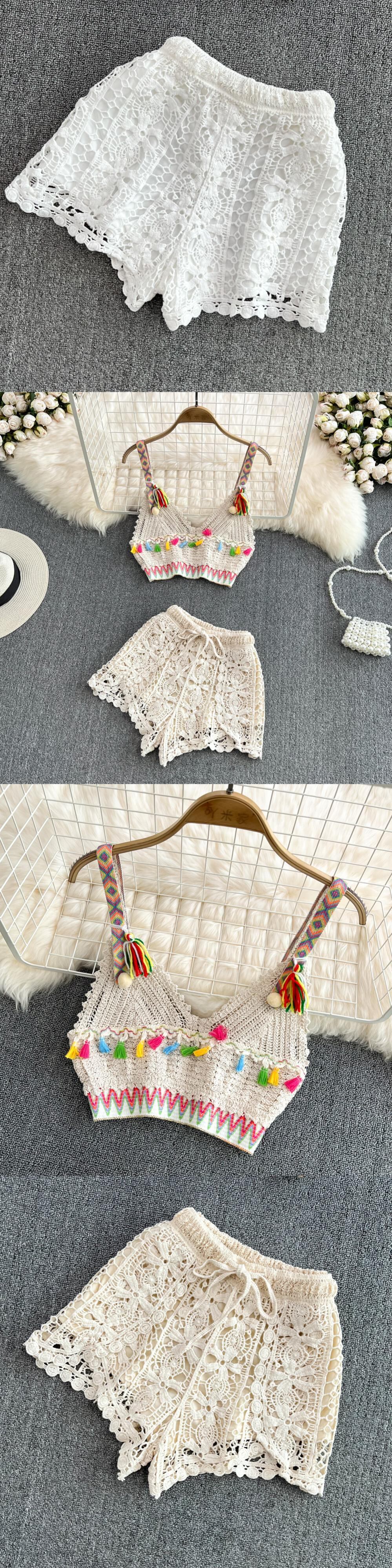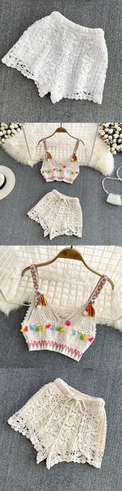 シーサイドホリデースーツレディースサマーウェア2022レトロかぎ針編みホローニットサスペンダートップ+ショーツ2点セット 夏物 ブルマー Abe21883801606