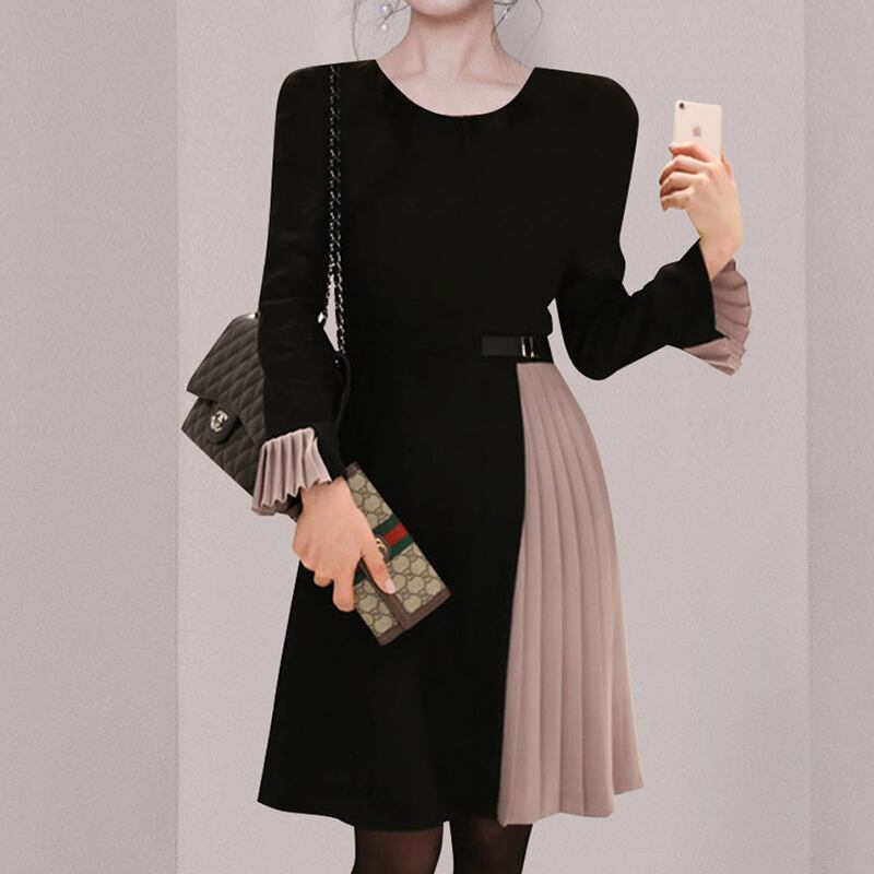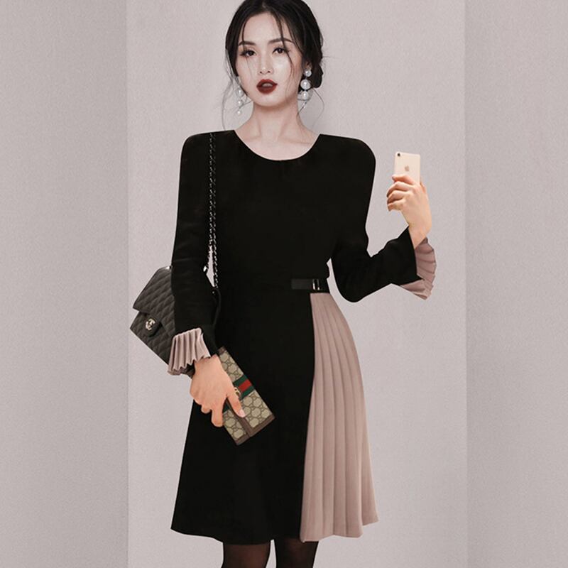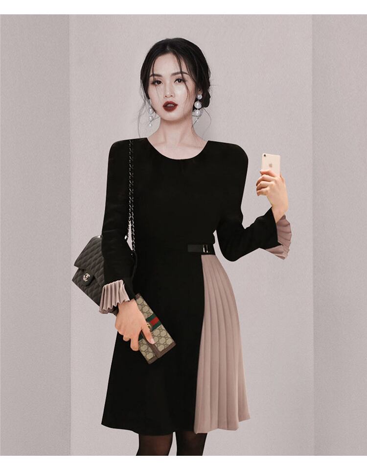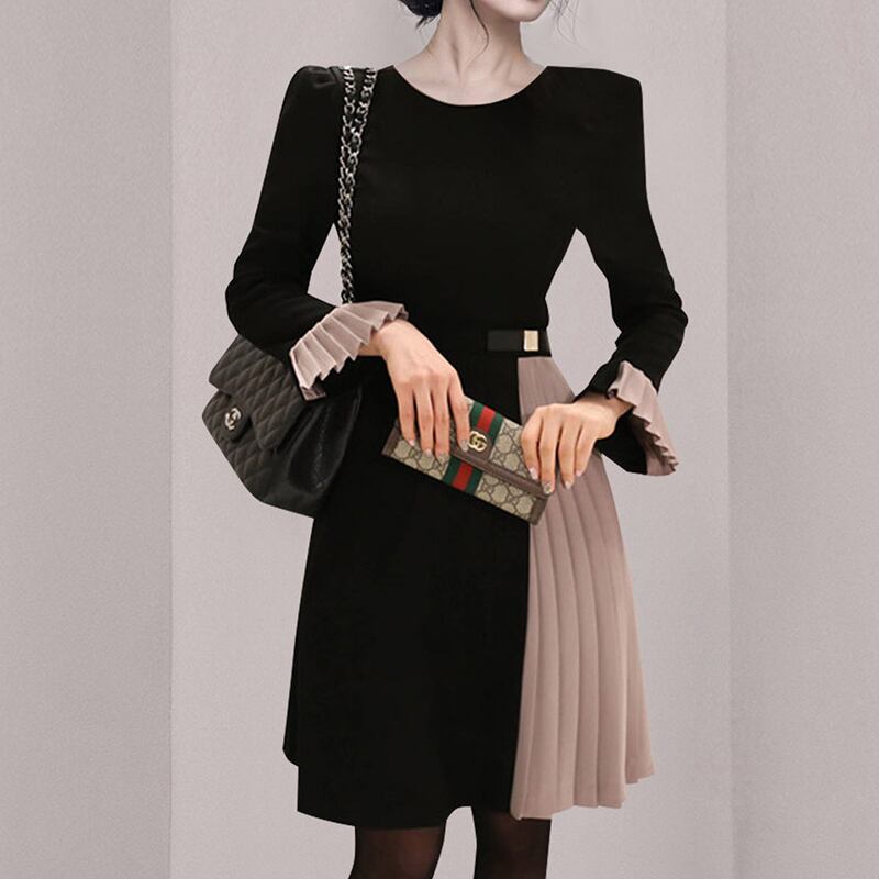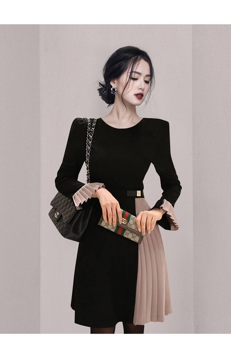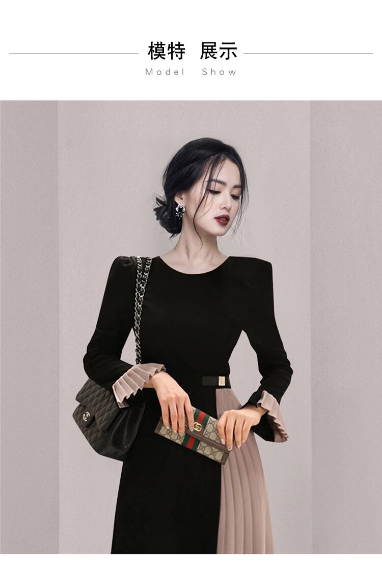 女性のドレス2021年秋オフィスレディスタイル長袖ソリッドフレアスリーブパネルOネックウエストブラックドレス ロング オータム 秋物 ソリッドカラー 会社 学校 通勤や通学にも Rhc86015592321