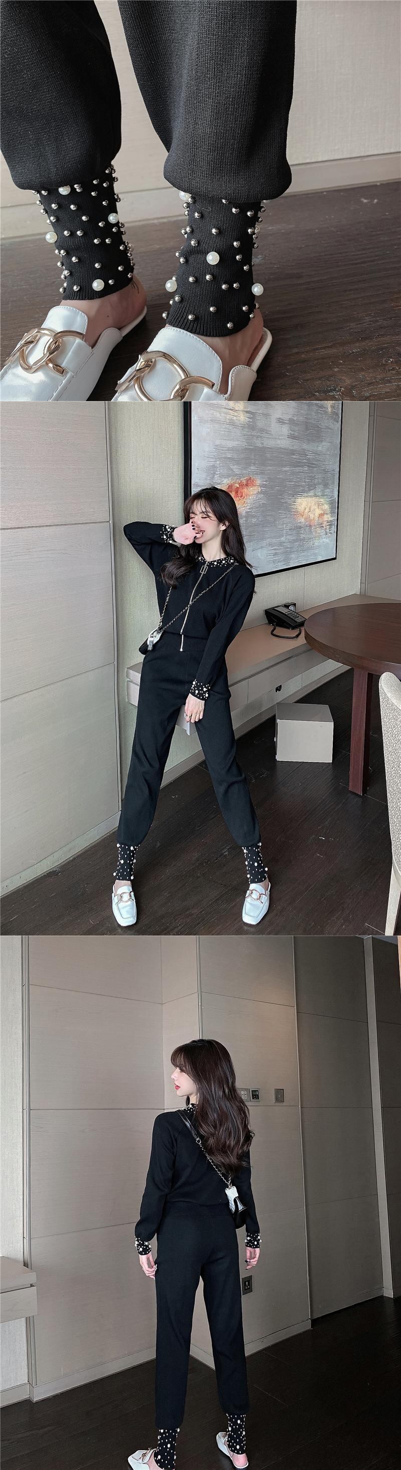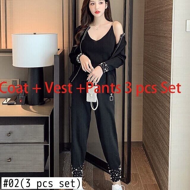 ニットトラックスーツレディーススーツ秋冬ビーディングジップカーディガンセーター+セクシーキャミソールベスト+スウェットパンツ3点セット ウィンター 冬物 Rhc25818785009