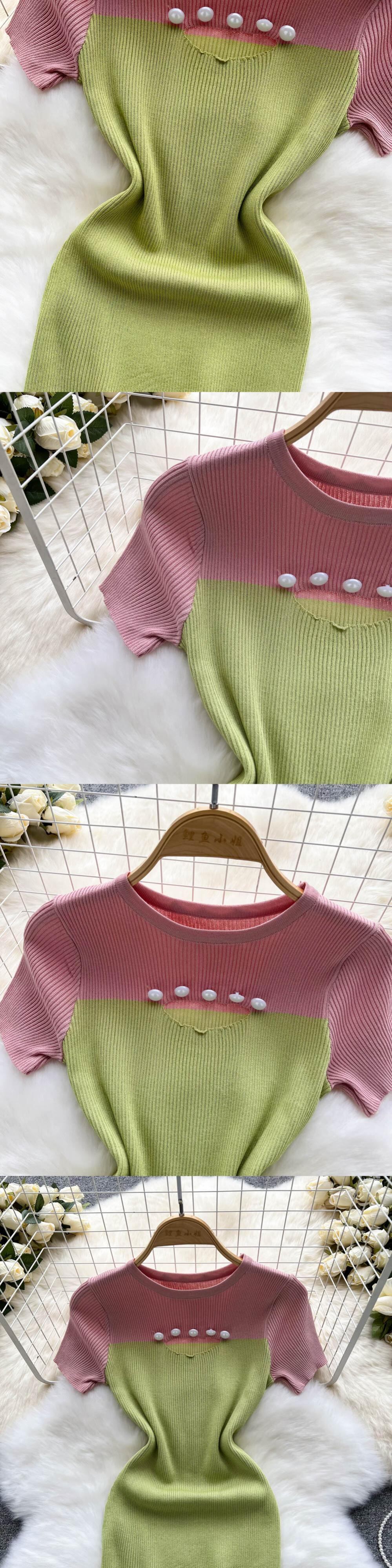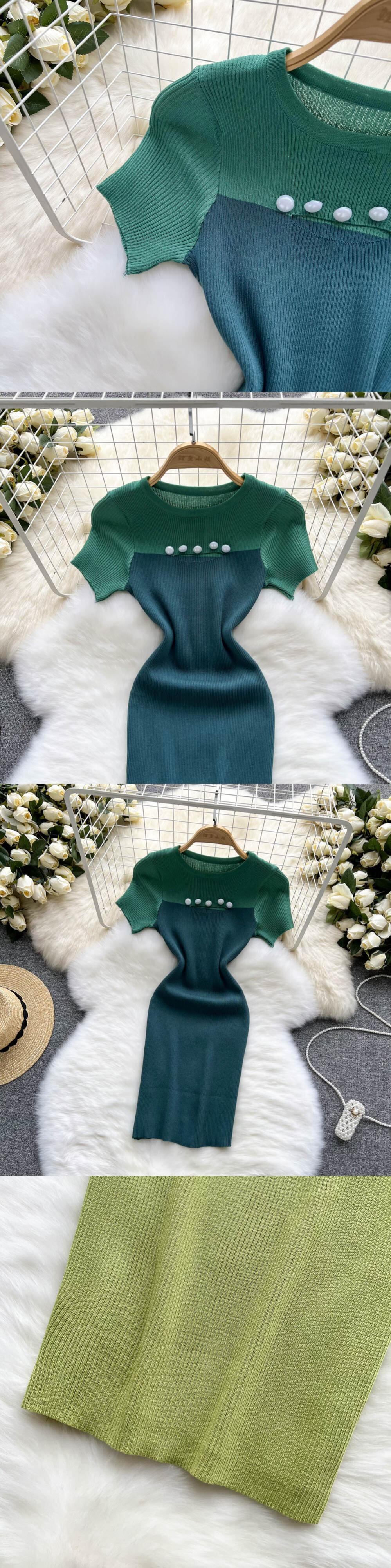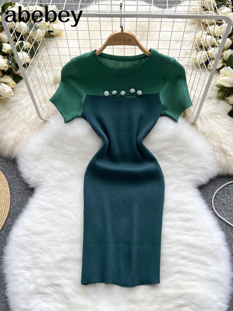 2022年春夏ニットOネックドレス女性コントラストカラーショートボディコンドレス スプリング 春物 サマー 夏物 Abe44041053579