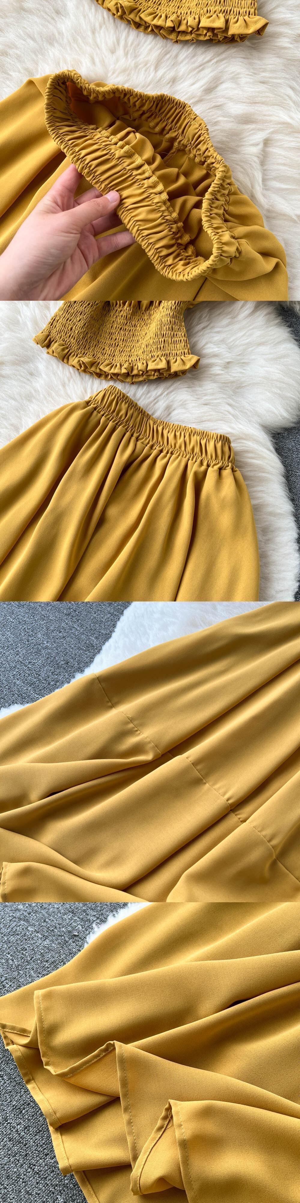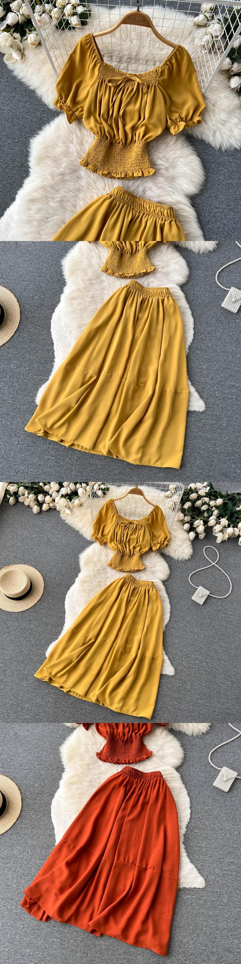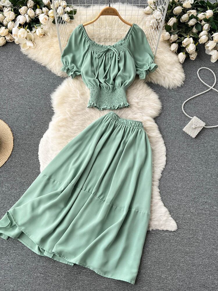 グリーン/ピンクスクエアカラー無地ブラウス+スカートスーツ秋ツーピースセット半袖レディース衣装 ショート ハーフスリーブ オータム 秋物 ソリッドカラー スクウェア Abe1609696693