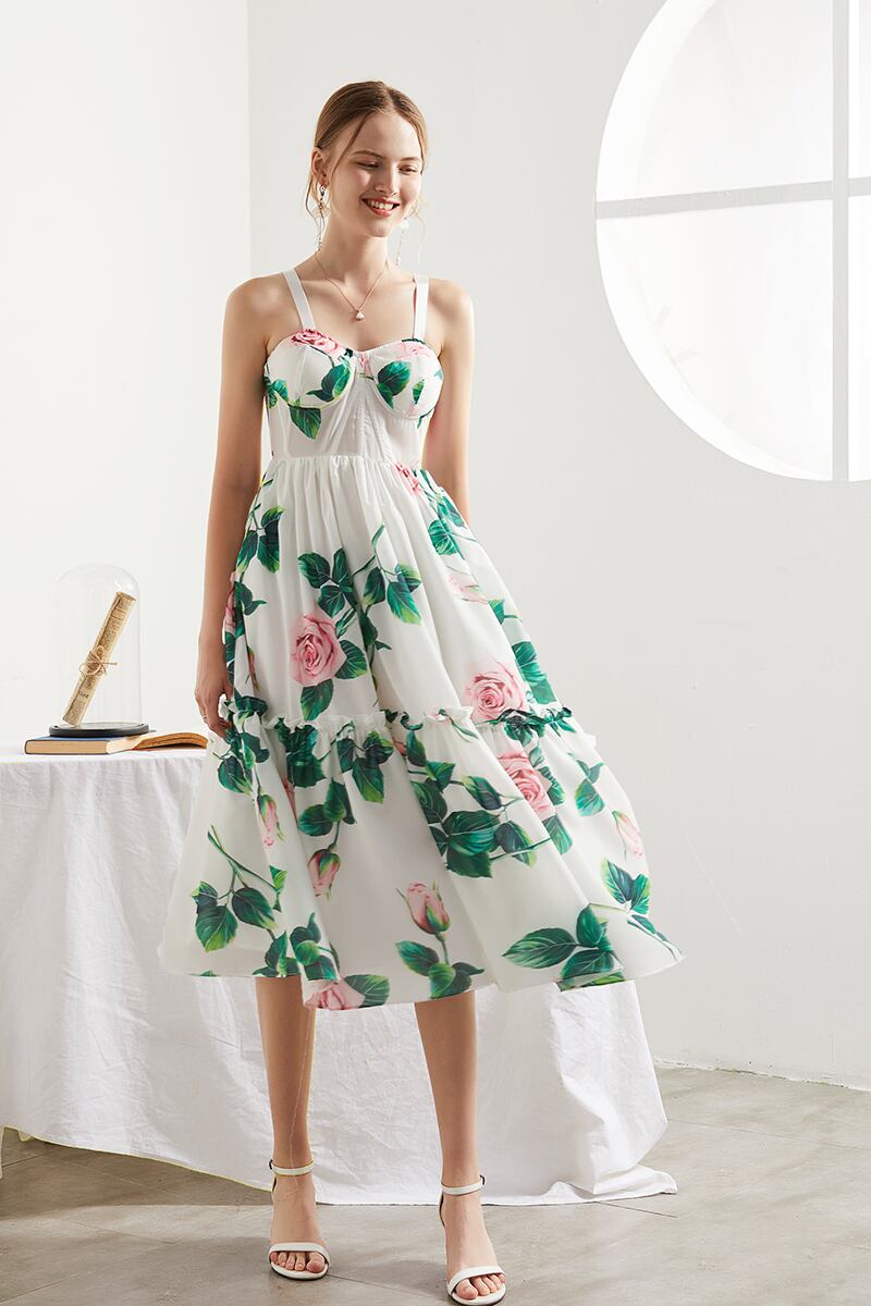 滑走路サマースパゲッティストラップレディースドレス2021ホワイトローズフラワープリントロングパーティードレス 夏物 フラワーデザイン Rhc290817347