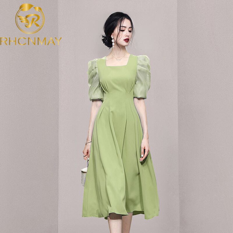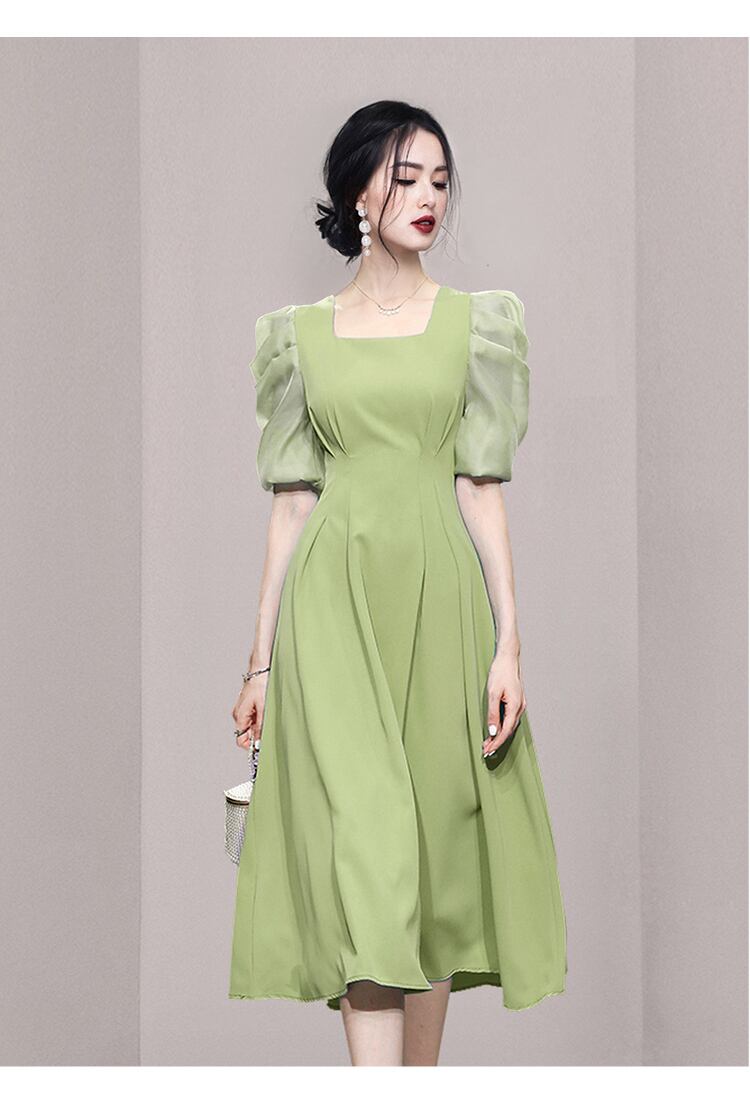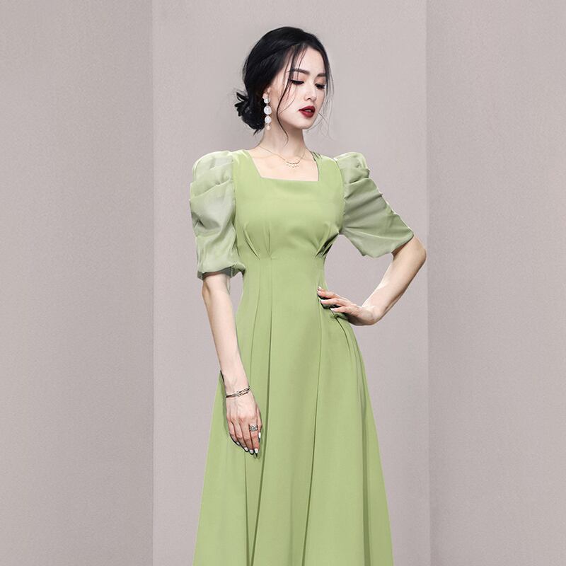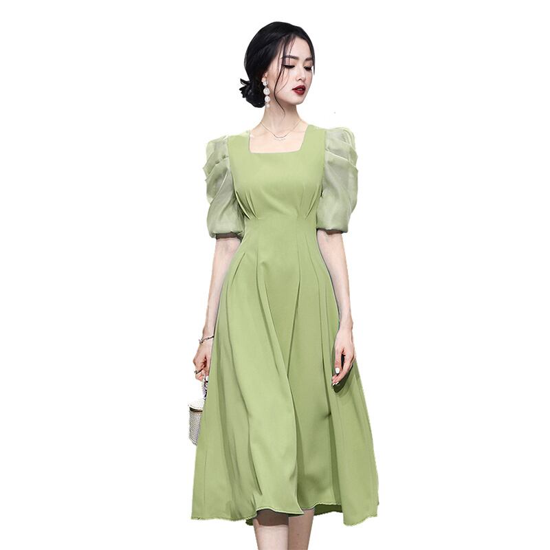 夏の女性フレンチパフスリーブミディAラインドレスグリーンレトロスクエアカラースリムウエストドレスイブニングパーティードレス サマー 夏物 スクウェア Rhc15021307640