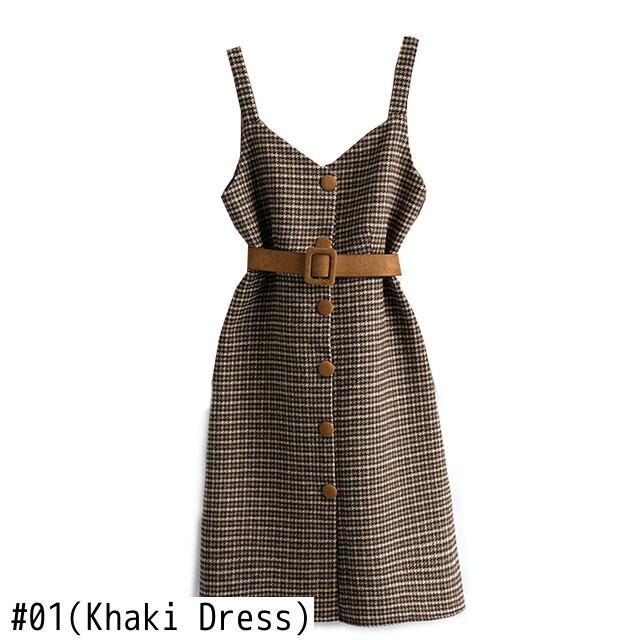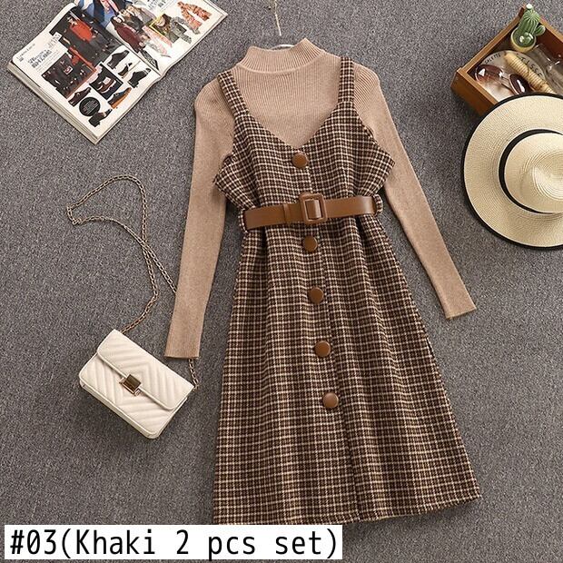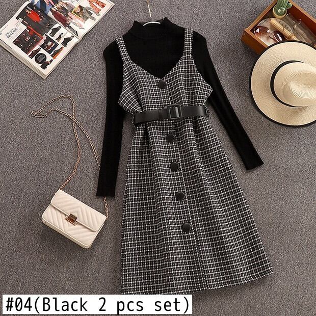 2020秋冬女性長袖ニットTシャツ+ツイードブレンドチェック柄ワンピース2点セット衣装無料ベルト ロング オータム 秋物 ウィンター 冬物 ハーネス Rhc69490054568