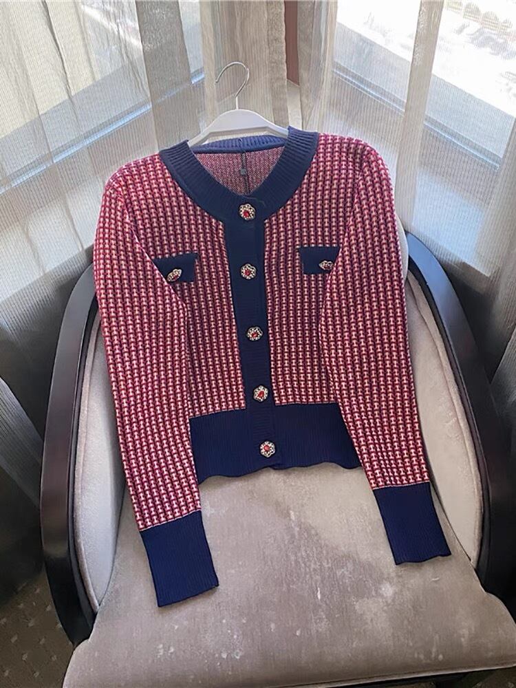 赤い格子縞のカーディガンクロップトップ2021年秋女性クロップドセーターコートフルラウンドネックダイヤモンドバックルニットカーディガントップス レッド Oネック Rhc47292664053