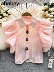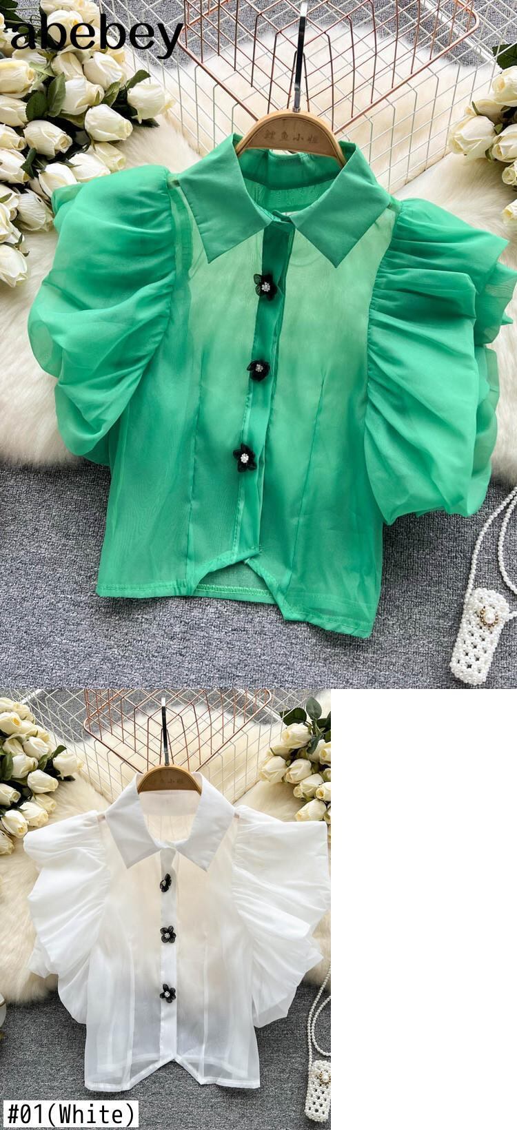 ホワイトシャツレディースラペルパフスリーブソリッドミニマリストシャーリングブラウス2022年夏 サマー 夏物 ソリッドカラー Abe48816829149