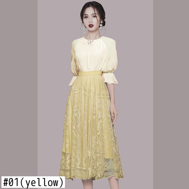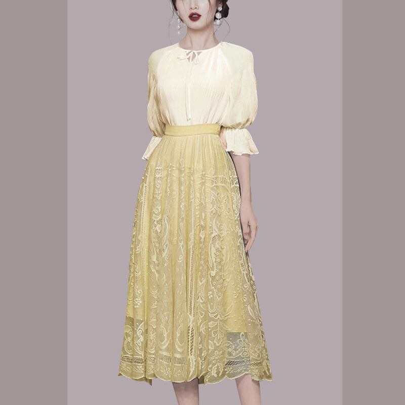 2点セット女性サマーランタンスリーブOネックシャツブラウス+ウエストボディコンレース刺繡スカートオフィスレディスーツ 刺繍 夏物 会社 学校 通勤や通学にも Rhc80406572304