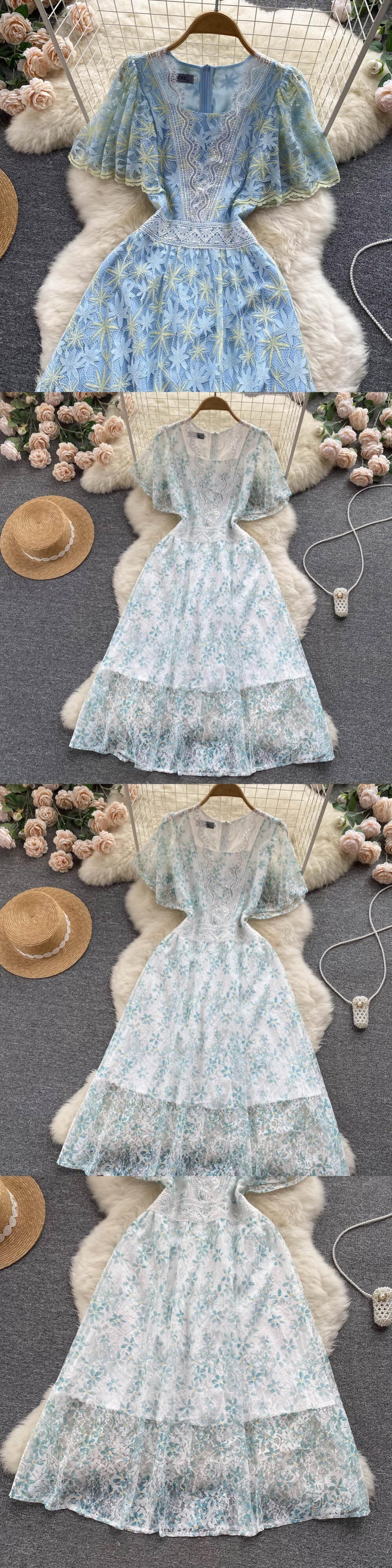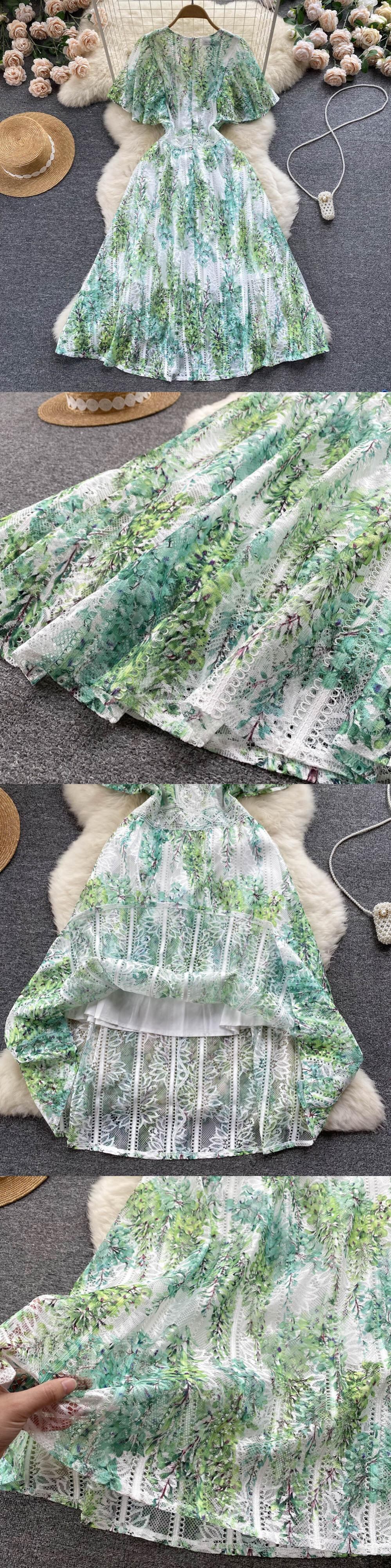 夏の女性グリーンプリントパーティーマキシロングドレスボヘミアン半袖ウエストスクエアカラーローブVestidos ショート ハーフスリーブ サマー 夏物 スクウェア Abe51344250545