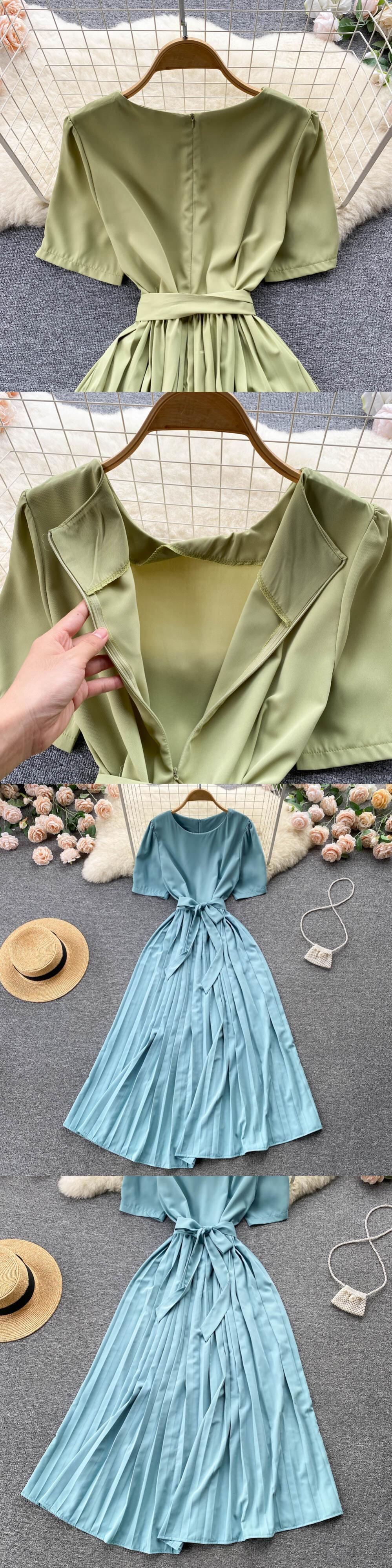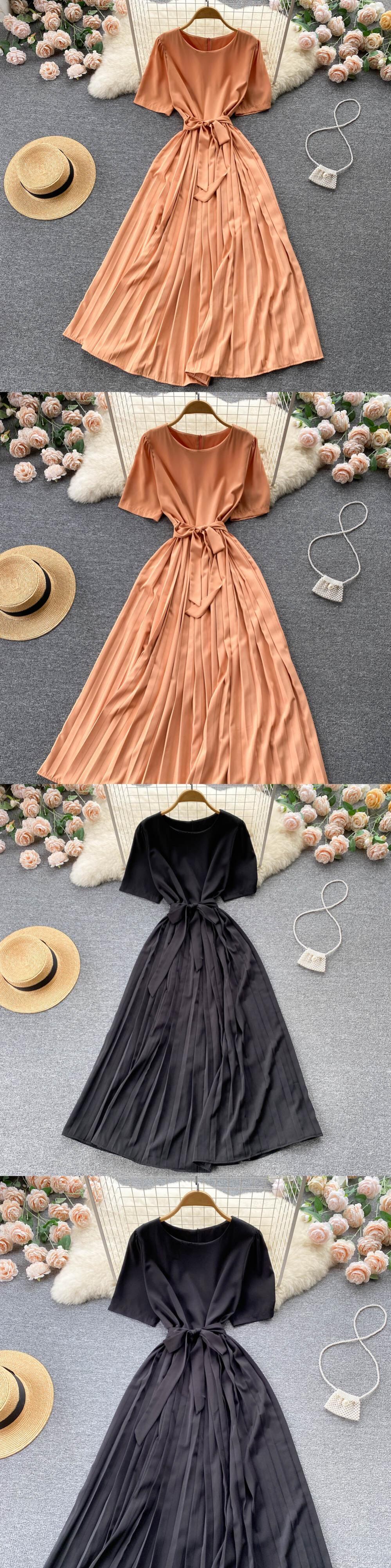 フレンチプリーツドレスレディース半袖OネックソリッドAラインドレス2022サマーシフォンバケーションビーチサンドレス ショート ハーフスリーブ 夏物 ソリッドカラー Abe97692182595