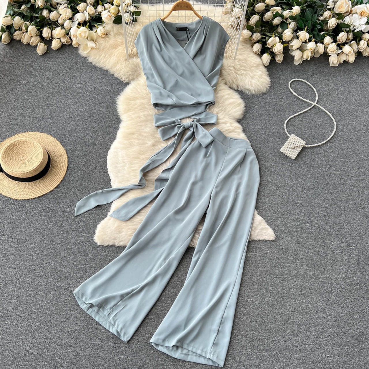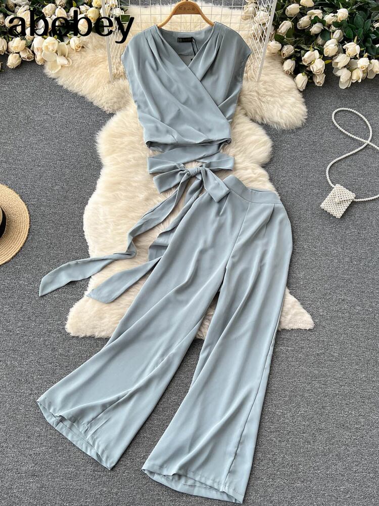 女性セットソリッドタンクノースリーブクロップトップウエストワイドレッグパンツスーツレディトラックスーツラウンジウェア ワイドパンツ ソリッドカラー Abe66421117950