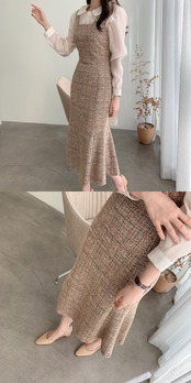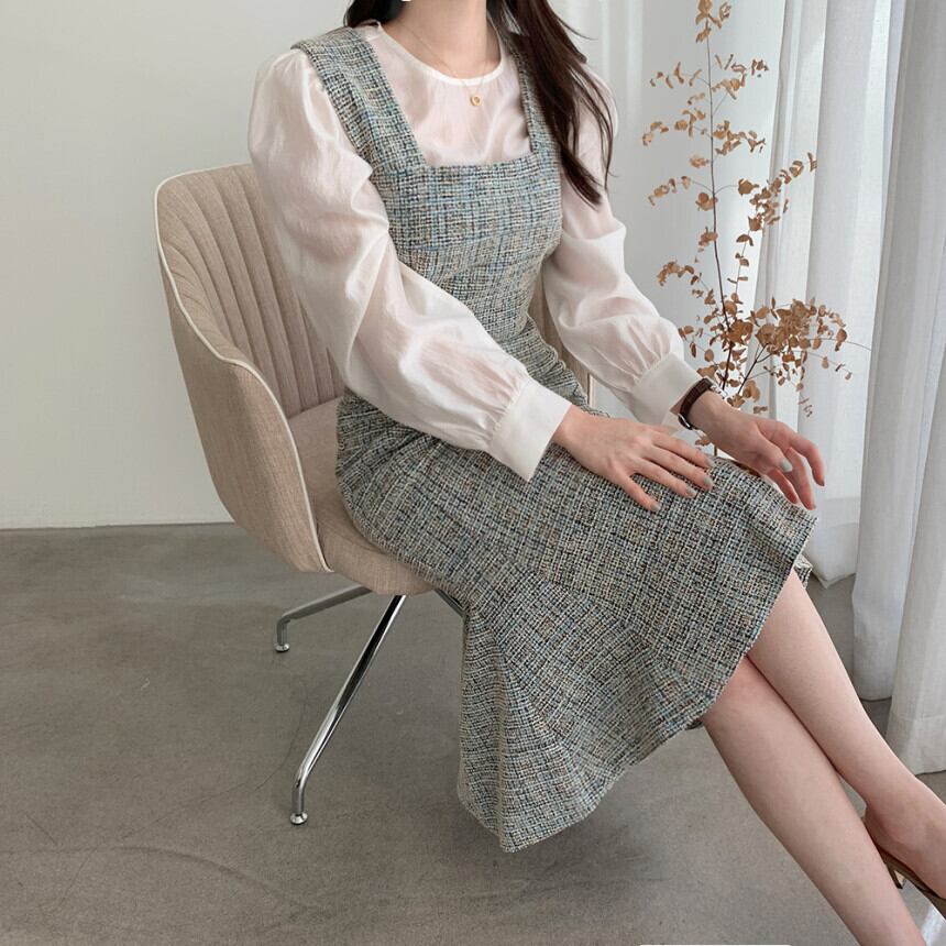 秋冬女性ロングツイードドレスサスペンダーストラップスクエアカラースリムチュニック2021ドレス オータム 秋物 ウィンター 冬物 スクウェア Rhc49746402678
