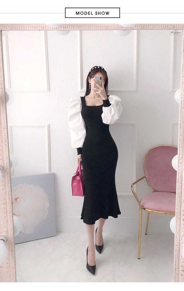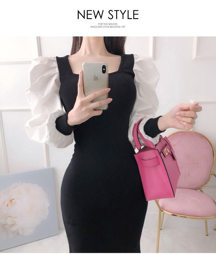 秋のシックなパッチワークスクエアカラー透明ランタンスリーブニットスリムマーメイドニットドレスオフィスレディ オータム 秋物 スクウェア 会社 学校 通勤や通学にも Rhc2590107413