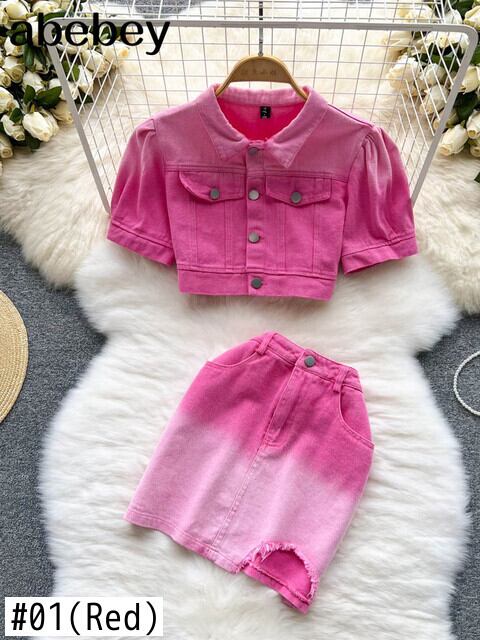 2022デニムピンクセクシーな女性セットグラデーションボタンポケット半袖クロップトップデニムスカートツーピースセットの衣装 ショート ハーフスリーブ Abe31547682929