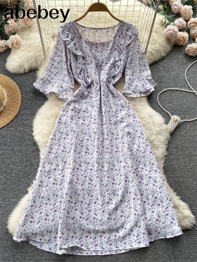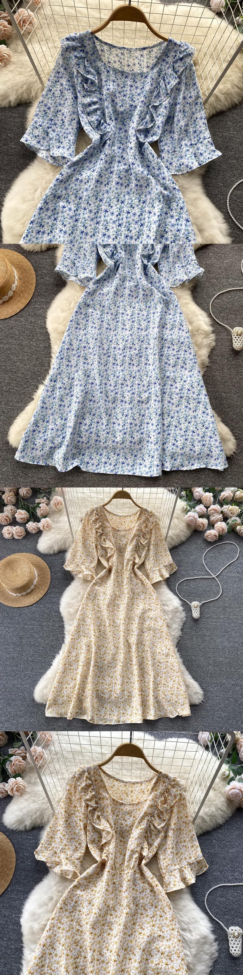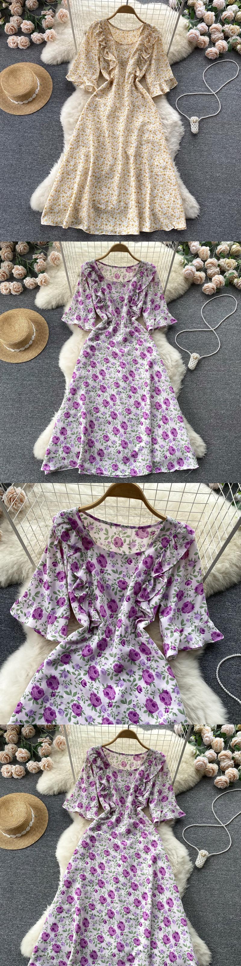 サマースクエアカラーフローラルプリントドレスフレア半袖ウエストバケーションビーチ ショート ハーフスリーブ 夏物 花柄 スクウェア Abe8831542740