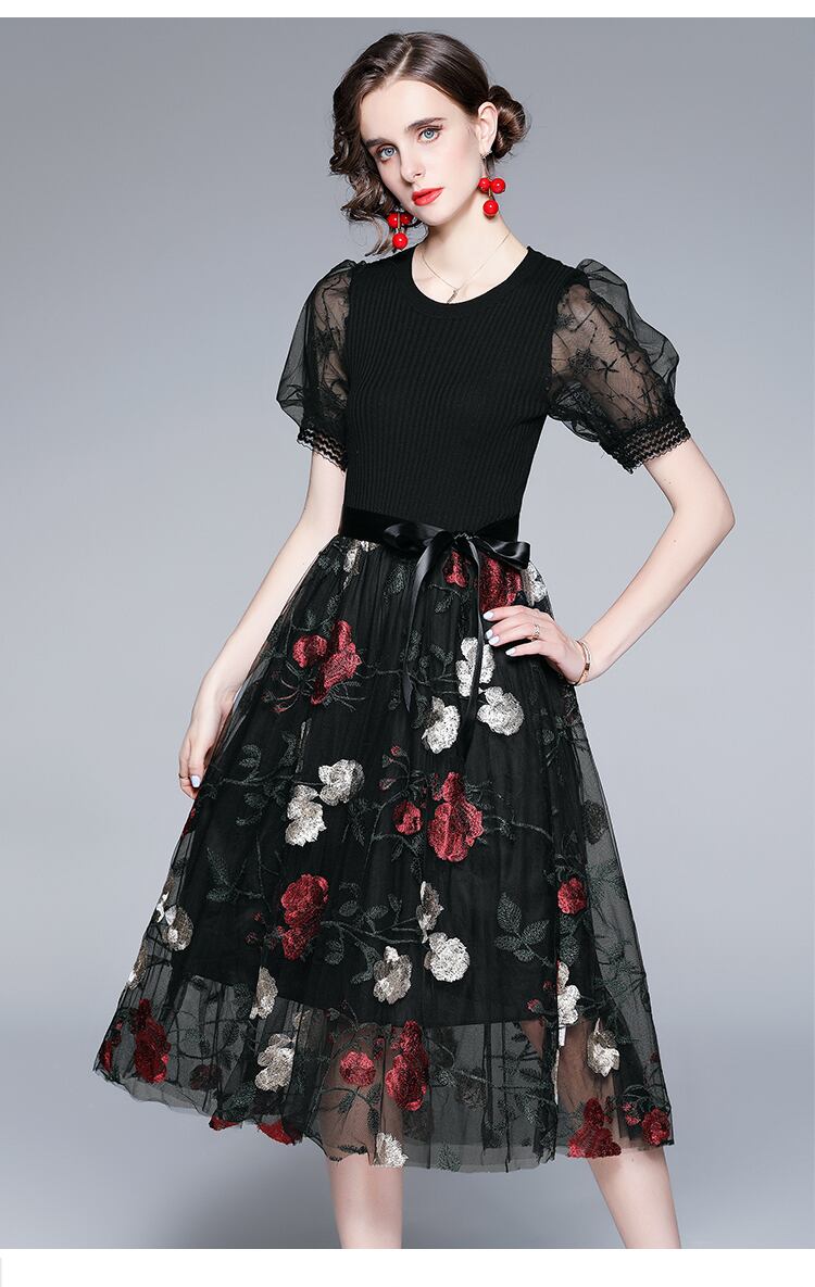 女性2021年サマーパフスリーブニットパッチワークメッシュ刺繡フラワースリムミディドレス 刺繍 夏物 フラワーデザイン Rhc66341014744